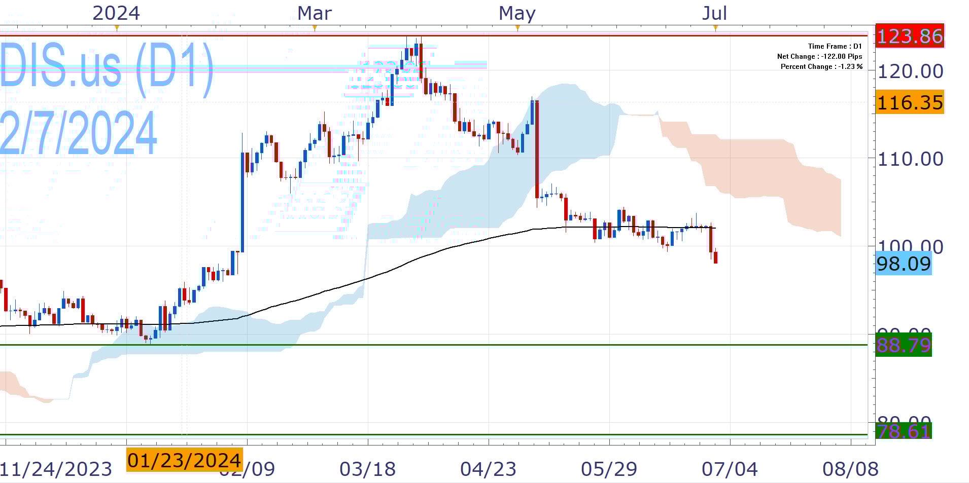 These developments have helped the stock to a relief rally from the 2021-2023 plunge that culminated in October's multiyear lows and the promising signs offer reasons for optimism. But after a strong start to the year, the rebound has faltered with a nearly 20% drop in Q2, creating scope for new 2024 lows (88.79) that would bring the aforementioned lows in the spotlight. This decline highlights the challenges that still lie ahead, amidst struggling linear assets, increasing streaming competition and some concerns over its parks outlook.