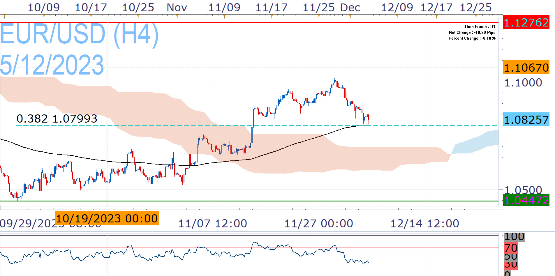 EUR/USD faces pressure today after Ms Schnabel's remarks, retesting the critical 38.2% Fibonacci of its recent relief-rally and the EMA200. Daily closes below it could send it into the daily Ichimoku Cloud (starting at around 1.0700), but the 2023 lows are distant (1.0447).