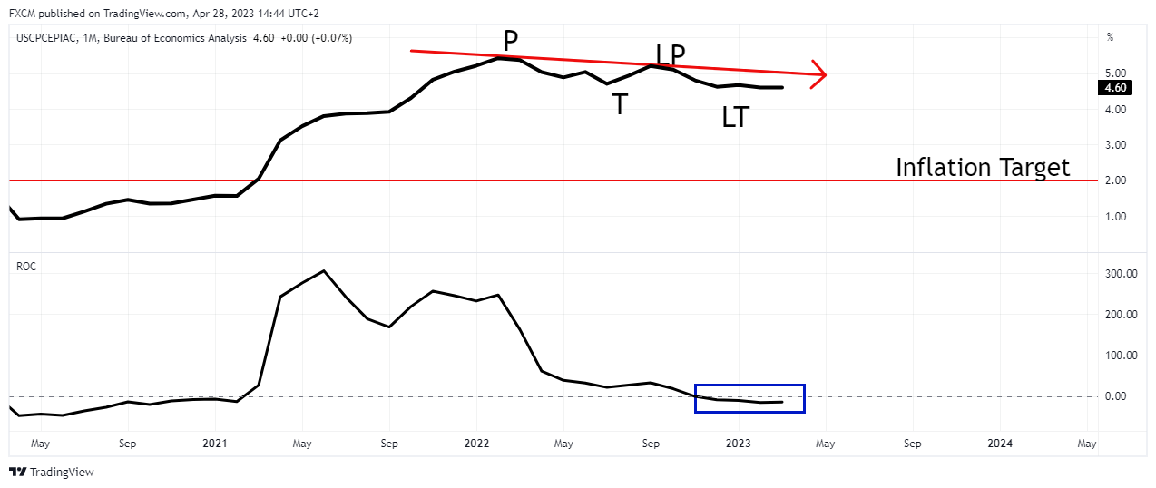 United States core PCE (which excludes food and energy) printed at 4.6% y/y and the previous number was revised higher to 4.7% y/y. The annual change has a lower peak (LP) followed by a lower trough (LT) and its rate of change (ROC) is on the deceleration side of zero (blue rectangle). This needs to maintain for the disinflation process to unfold towards the Fed's inflation target of 2%. However, the monthly core PCE came in at 0.3%, which is 3.66% annualised – still high and above target.