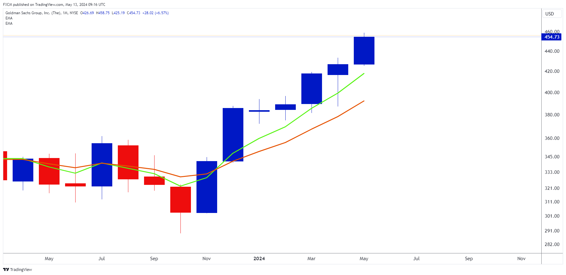 Goldman Sachs traded at a new all-time high on Friday. Technically its exponential moving averages are in a bullish formation, with the green 5-month EMA above the orange 10-month EMA. The stock may be overbought in the short-term but given its strong primary trend, support areas are likely to be compelling.