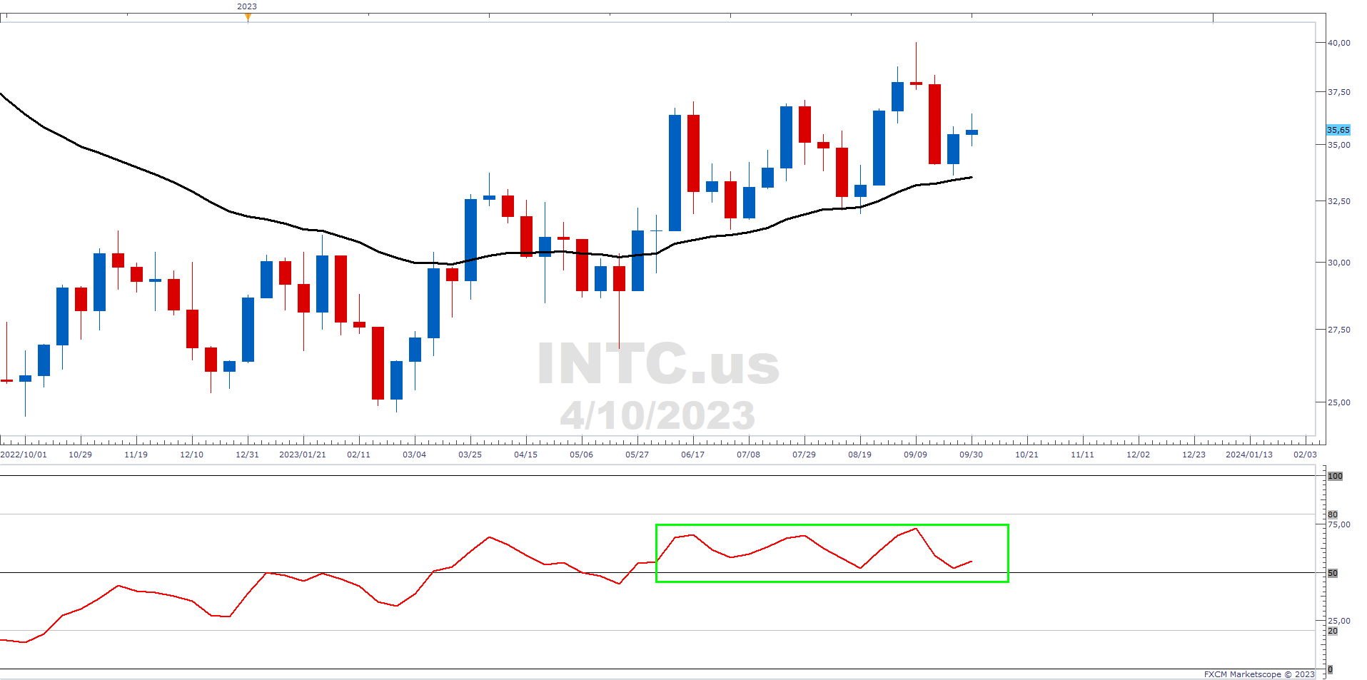 Intel's weekly chart has positive signs. Its candlesticks are trading above its black 30-week EMA and the EMA is turned up. The weekly RSI is above 50 (green rectangle). This is the positive side of the indicator, connoting an underlying bullish momentum. If maintained, this momentum is likely to be price supportive.
