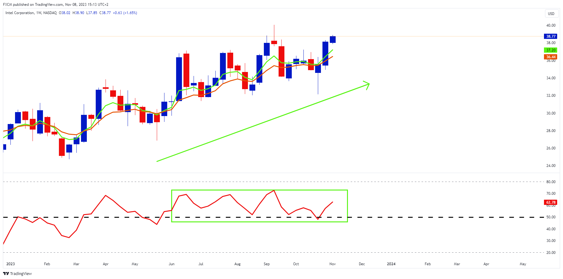 Intel has generally been trending up for 2023 (green arrow). It green 5-week EMA is above its orange 10-week EMA. This puts the EMAs into a bullish formation. Moreover, the RSI has been positioned over 50 for most of the year (green rectangle). This connotes an underlying bullish momentum which has been driving INTC.us higher. The longer the RSI maintains above 50, the great the momentum support for the stock.