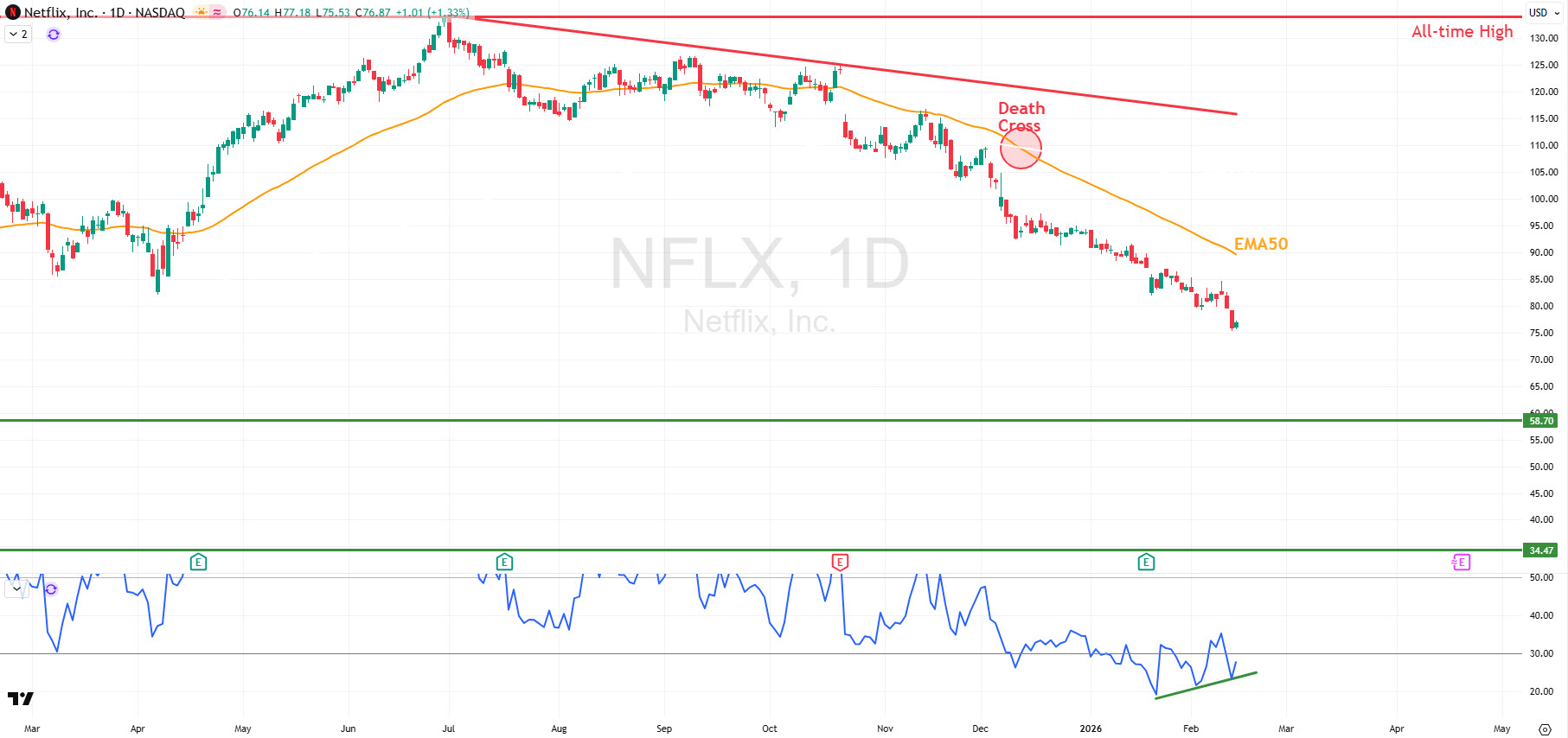 Heightened uncertainty around the Warner Bros deal, AI disruption risks, subdued financial performance and intense competition create a difficult backdrop. The stock is heading for a fifth straight monthly decline and may face further pressure towards 58.70 after a technical Death Cross EMA50 < EMA200).