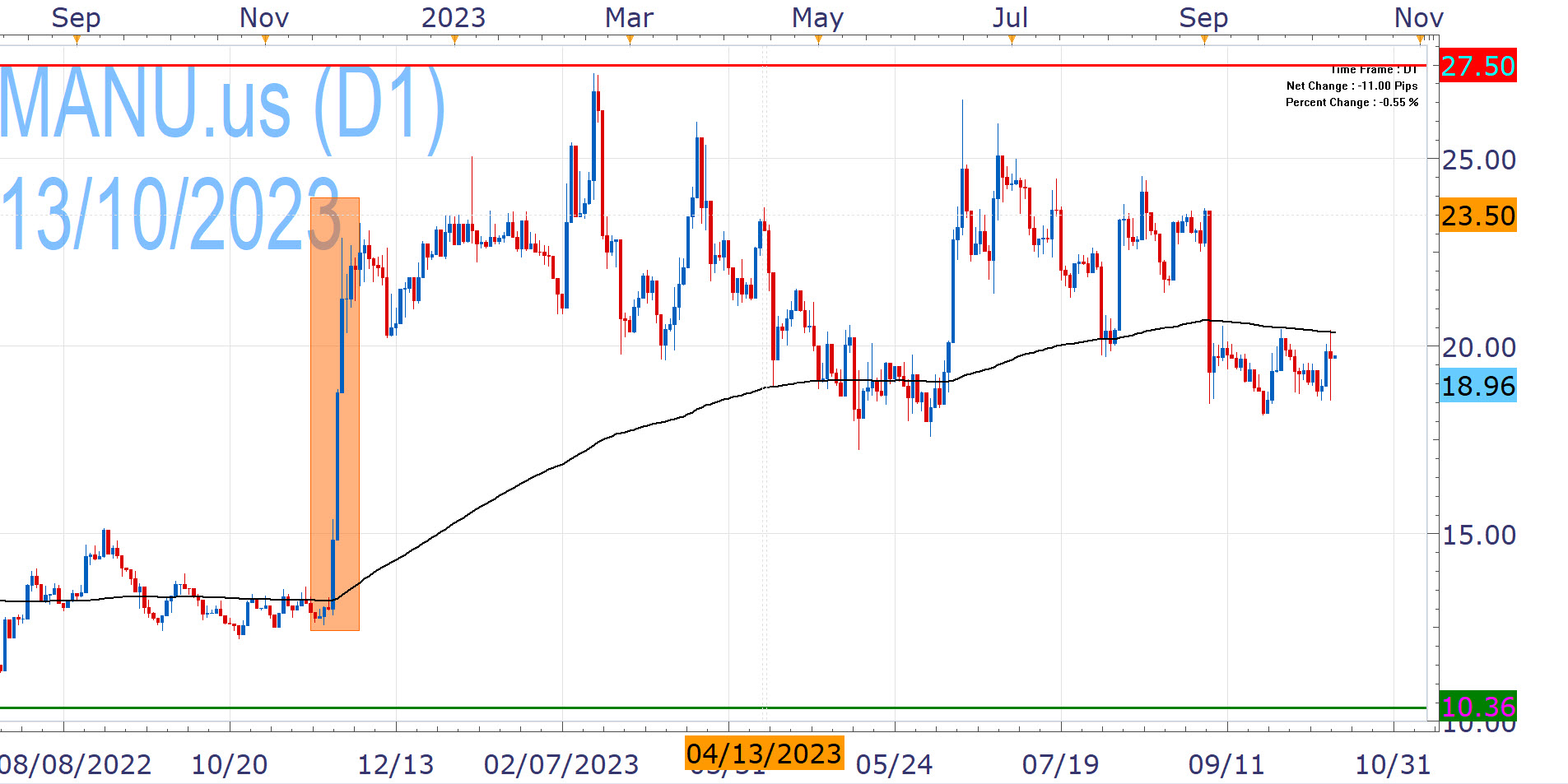MANU.us had soared last November after opening the door to an ownership change, registering its best monthly performance since it went public in August 2012 and a profitable 2022. It also surged in June as sale news intensified, but then declined into negative territory for the year. It has been volatile since Thursday, as investors digest David Beckham's remarks and the latest news around a potential sale.