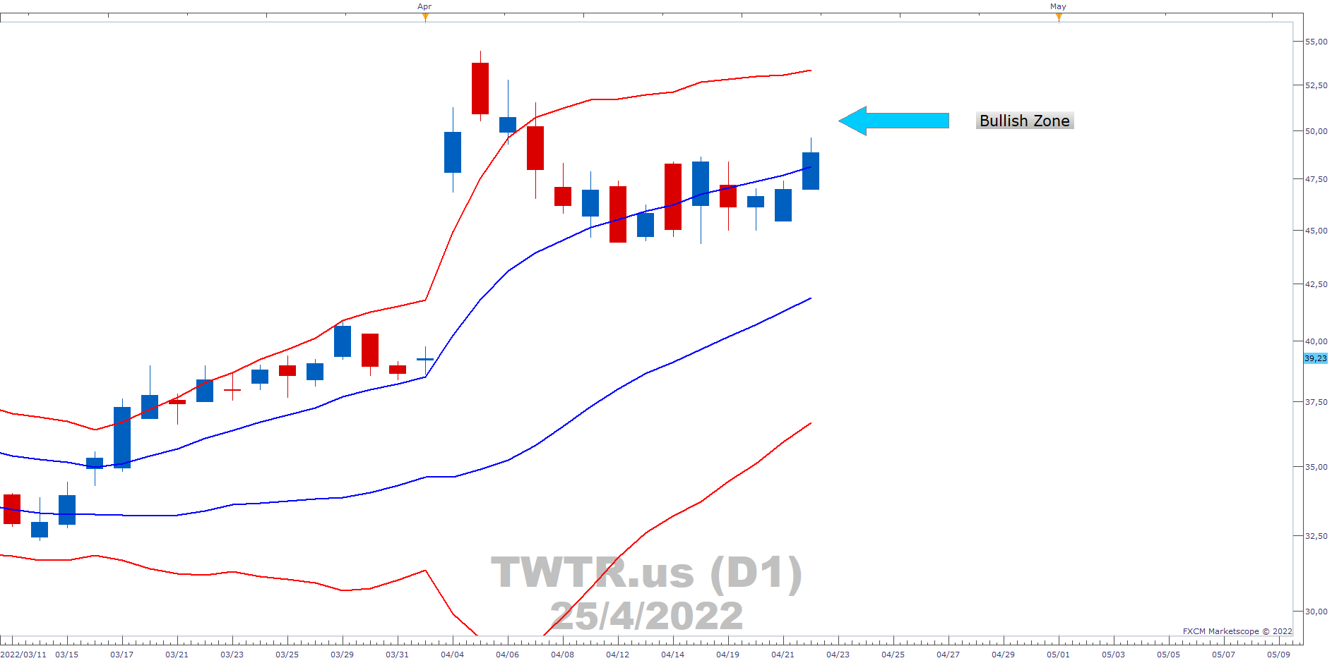 Twitter is trying to move back into its bullish zone, between the upper blue and red bands. The Wall Street Journal reported that the social media company met with Elon Musk yesterday to discuss his takeover bid. The total value of Musk's bid is $43 billion, or $54.20 per share - reported as being his "best and final" offer in a letter to the Twitter board.