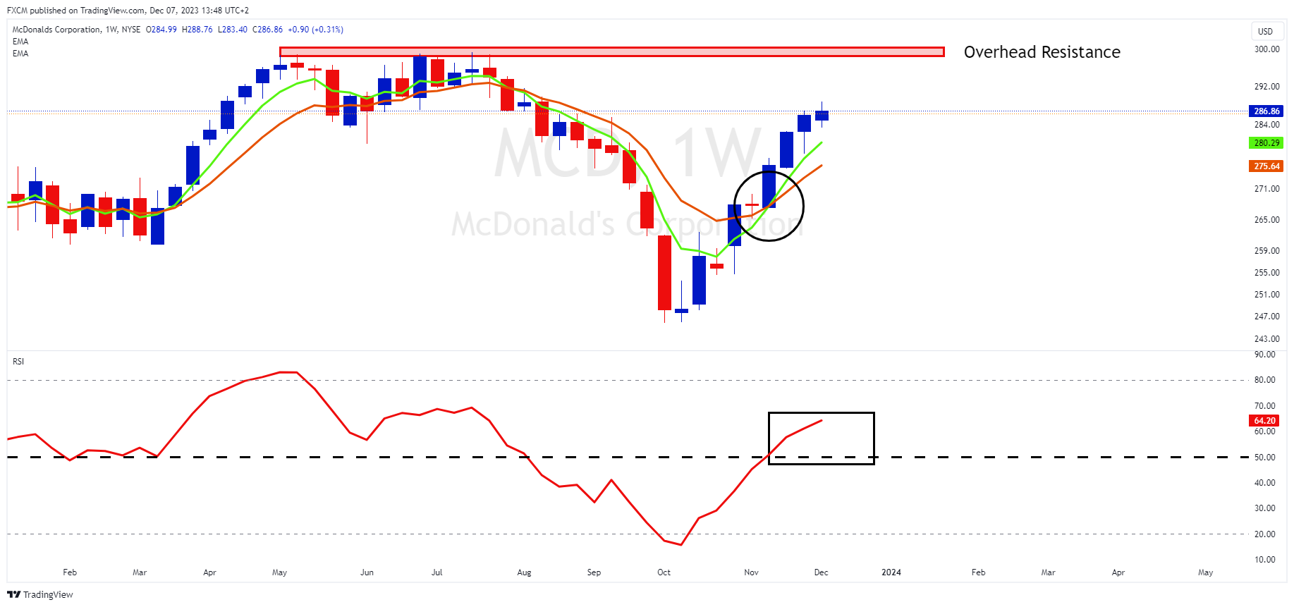 The McDonald's (MCD.us) weekly chart has bullish signs to it. It's green 5-week EMA has crossed above its orange 10-week EMA (black circle). This puts the EMAs into a bullish formation. Moreover, its RSI has popped above 50 (black rectangle). This is the bullish side of the indicator and the longer it maintains above 50 the greater the momentum support for the share price.