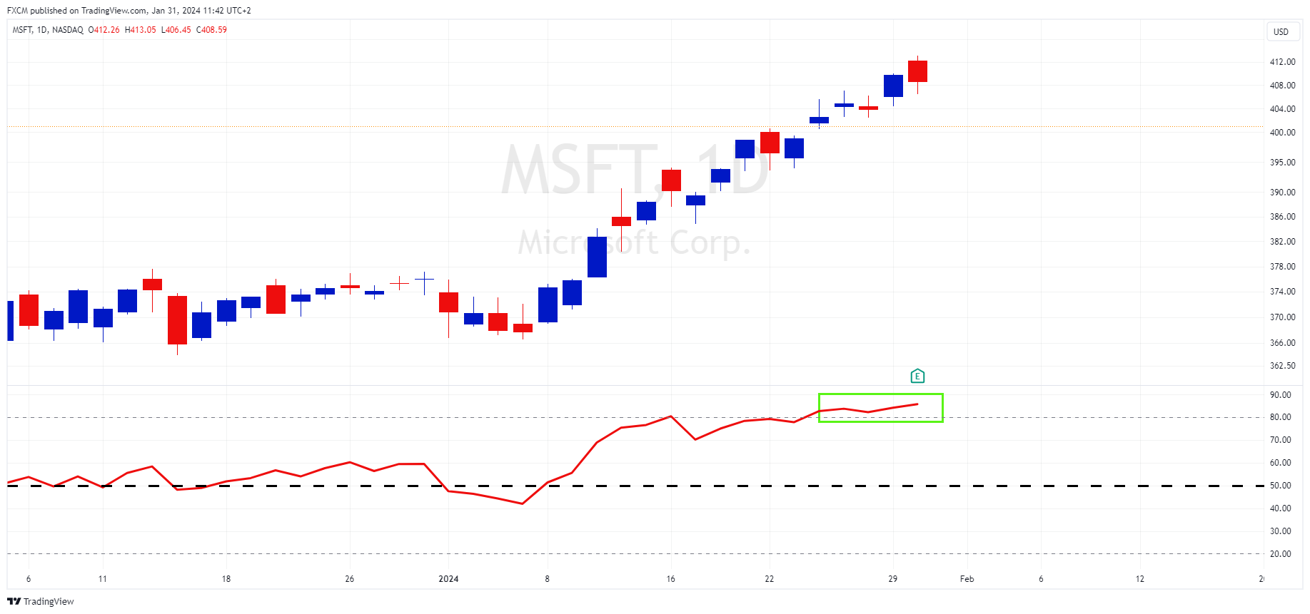 On a technical basis, MSFT.us is overbought with its RSI above 80 (green rectangle). This suggests a pullback may be due in the short-term as the oscillator normalises. However, given the strong primary uptrend, any short-term pullback may be an opportunity for the bulls to enter at a lower price.