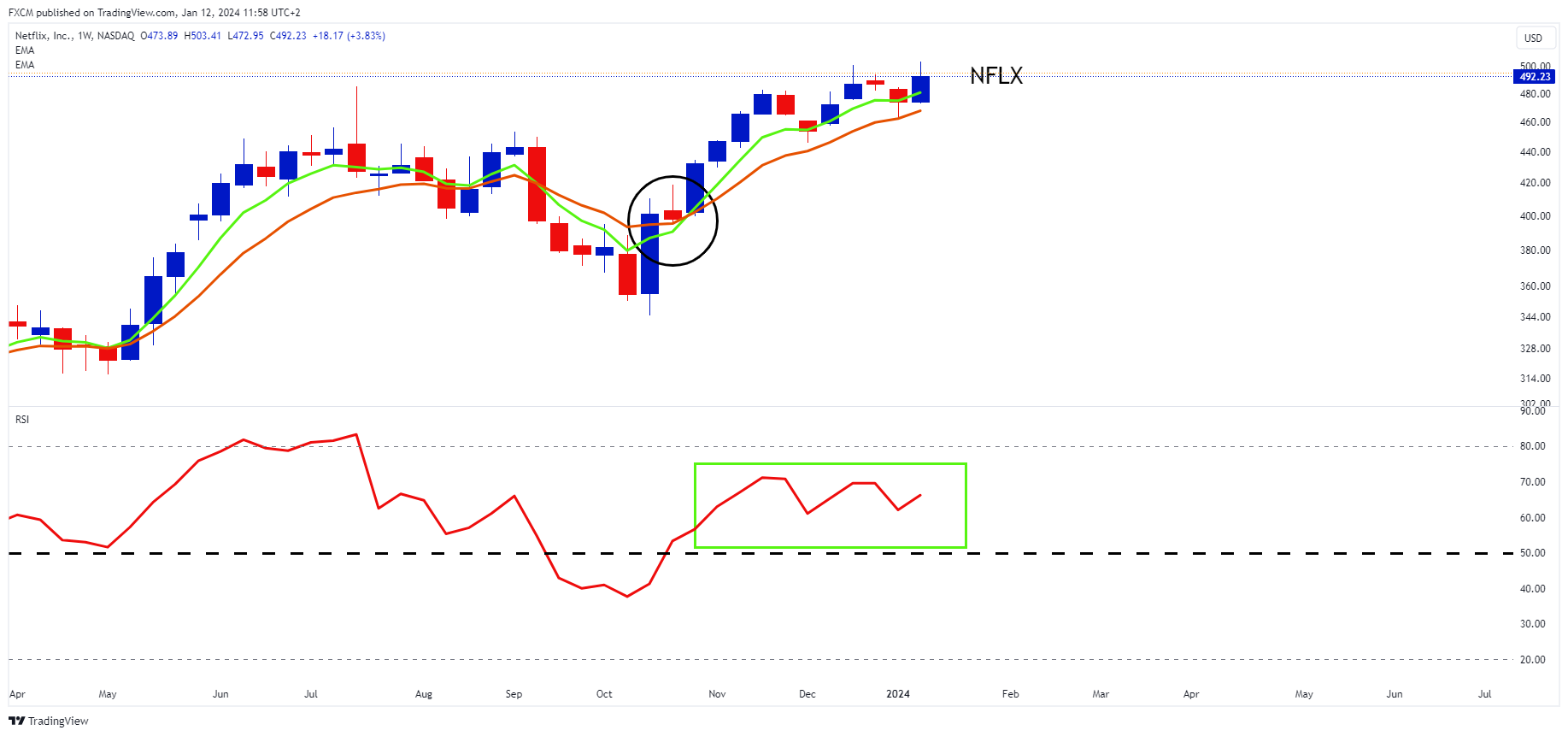 Technically the company remains supported. Its green 5-week EMA is above its orange 10-week EMA and its momentum-based RSI is on the bullish side of 50 (green rectangle):
