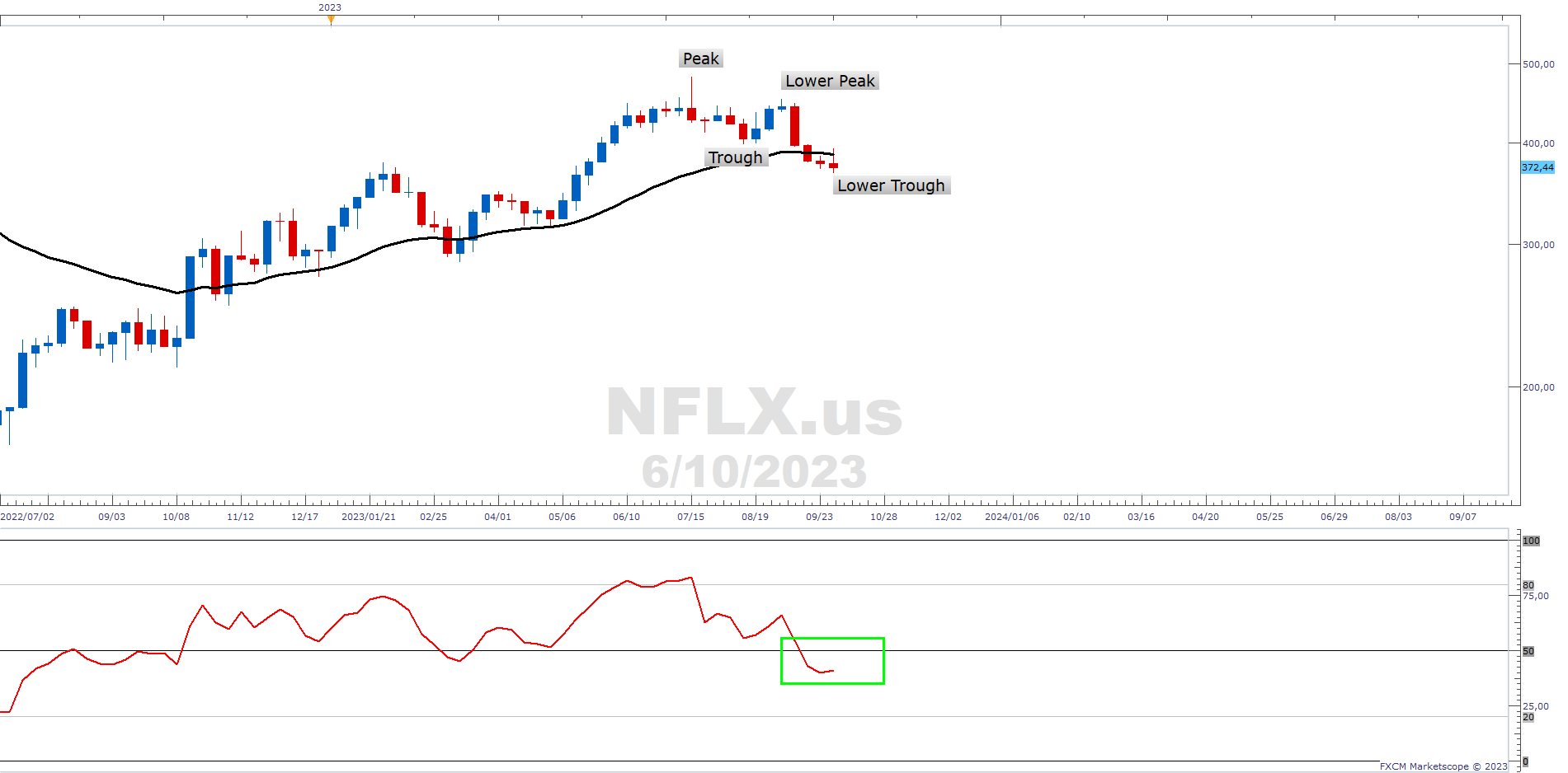 1. Netflix (NFLX.us) has charted a lower peak followed by a lower trough.