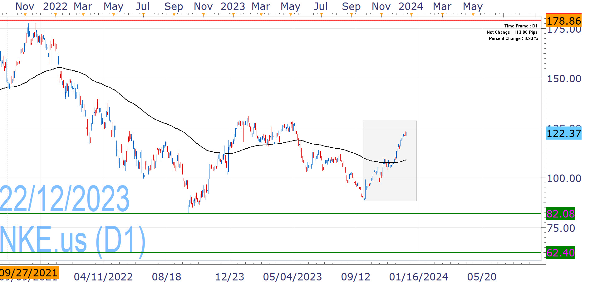 The first nine months of the year were bad for NKE.us, posting a historical losing streak in August, amidst a challenging external environment with elevated price pressures, tight monetary policy and economic uncertainty. Things are improving though, as most major central banks have made significant progress on inflation and interests rates have likely peaked, while the Fed projects at least three rate cuts next year. This has helped NKE.us to rally in Q4 and break into profits for the year.