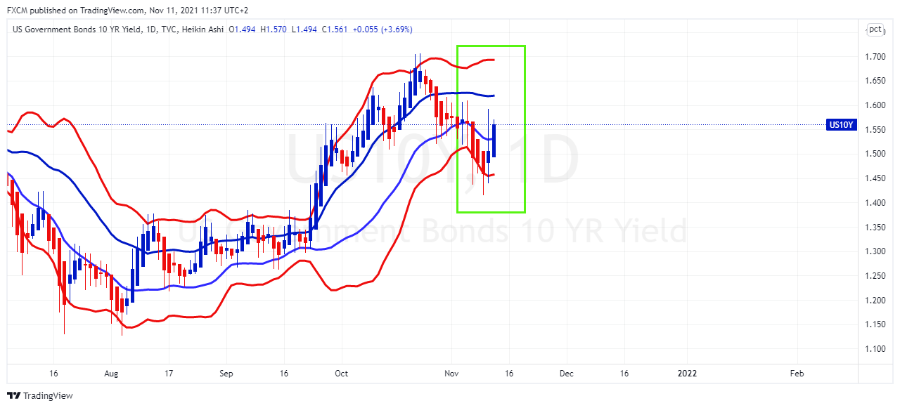 The chart above shows the Heiken Ashi US10Y. Its yield is a nominal yield i.e. it has an inflation adjustment component to it. Heiken Ashi candlesticks are trend-following indicators. Its change of colour from red to blue indicates a change in trend. Furthermore, this change comes as the candlestick moves from a weak area to a neutral area. From the lower blue/lower red band area to the lower blue/upper blue band area.