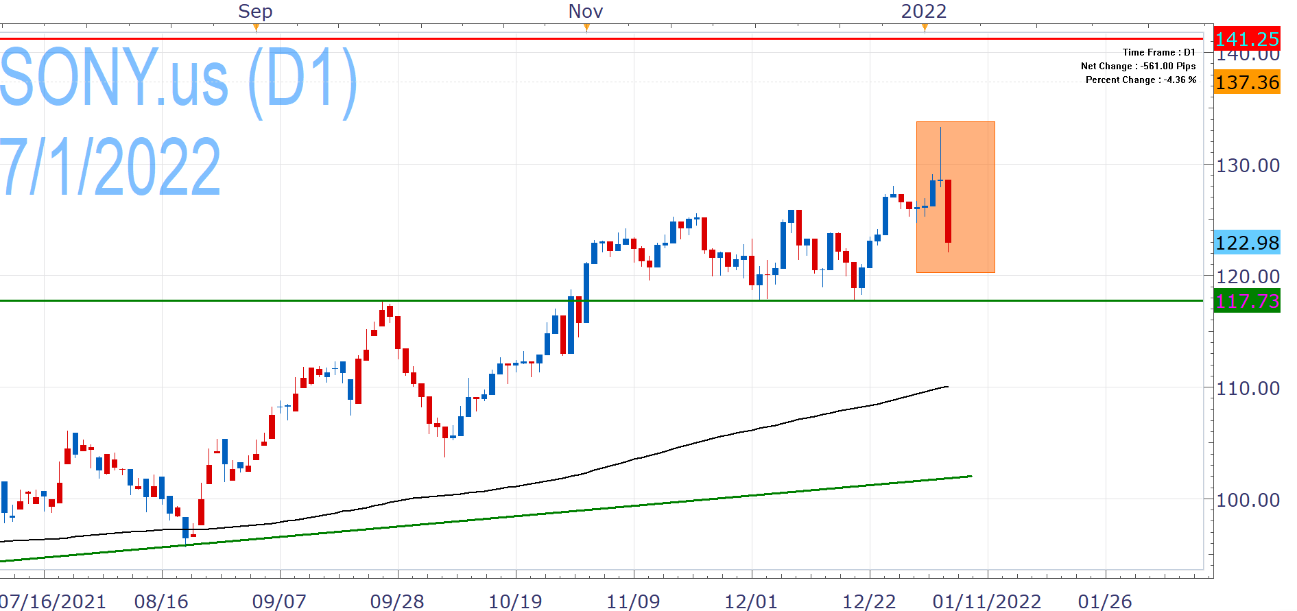 SONY.us had jumped to multi-year highs on Wednesday (134.26), but could not hold onto the gains amidst a broader hit to the tech sector, being in negative weekly territory after yesterday's close.