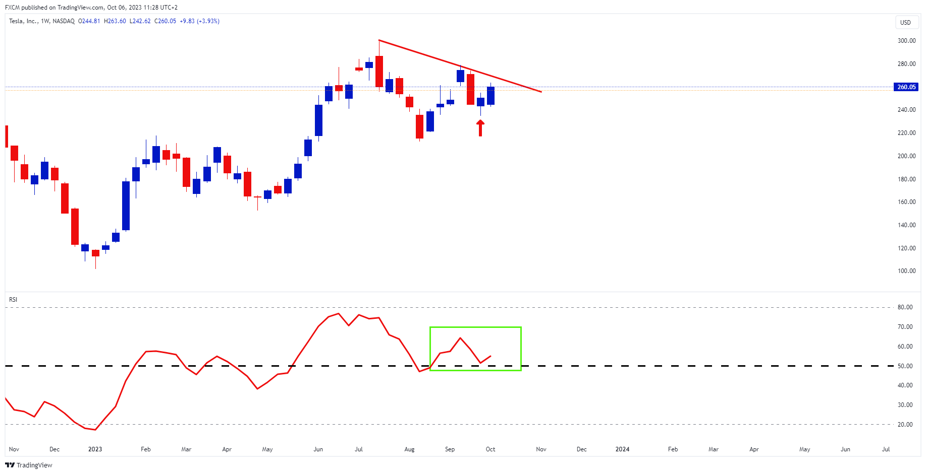- The RSI is on the bullish side of 50 (green rectangle).