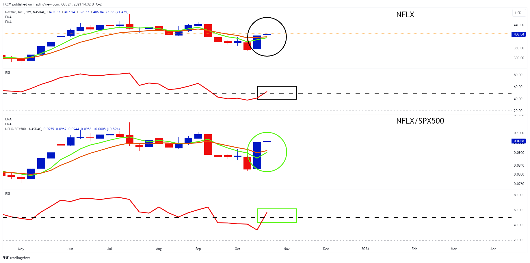 Moreover, the relative strength chart (NFLX/SPX500) shows that NFLX may move into an outperforming position compared to the broader index. The relative strength chart's green 5-week EMA is also looking to cross above its orange 10-week EMA, which would be a bullish development. The relative strength momentum is already favouring an outperformance, with the RSI moving to the bullish side of 50 (green rectangle). If the RSI maintains this position, NFLX.us should outperform the SPX500.