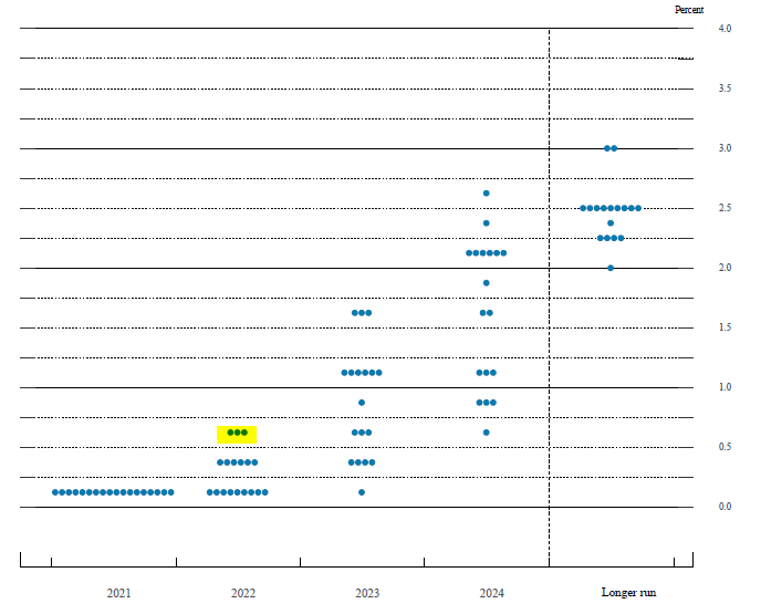We further note that 3 members are expecting a 50bps move in 2022 (yellow highlight). Given the forward-looking nature of financial markets the movement in yields and the greenback is not surprising as it starts to discount this hawkish change from the previous dot plots.