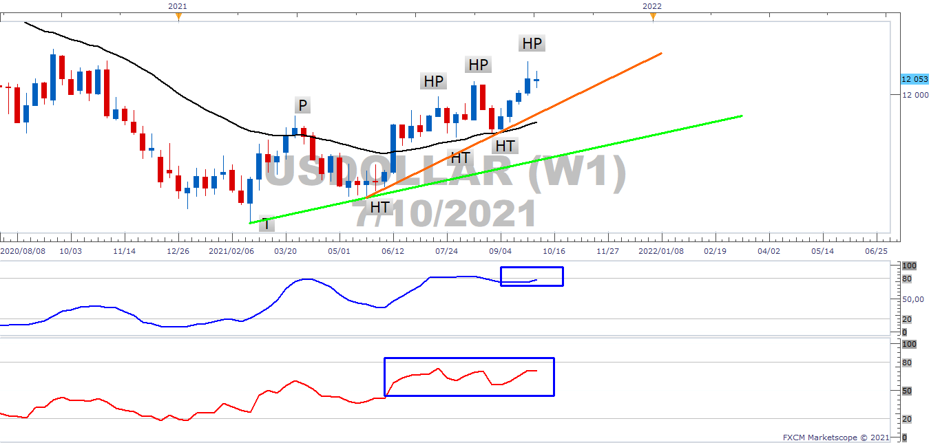- Importantly, the peaks and troughs are now defined by the orange trendline as opposed to the shallower green trendline. I.e., the trend's gradient has shifted up because the greenback's momentum has accelerated.