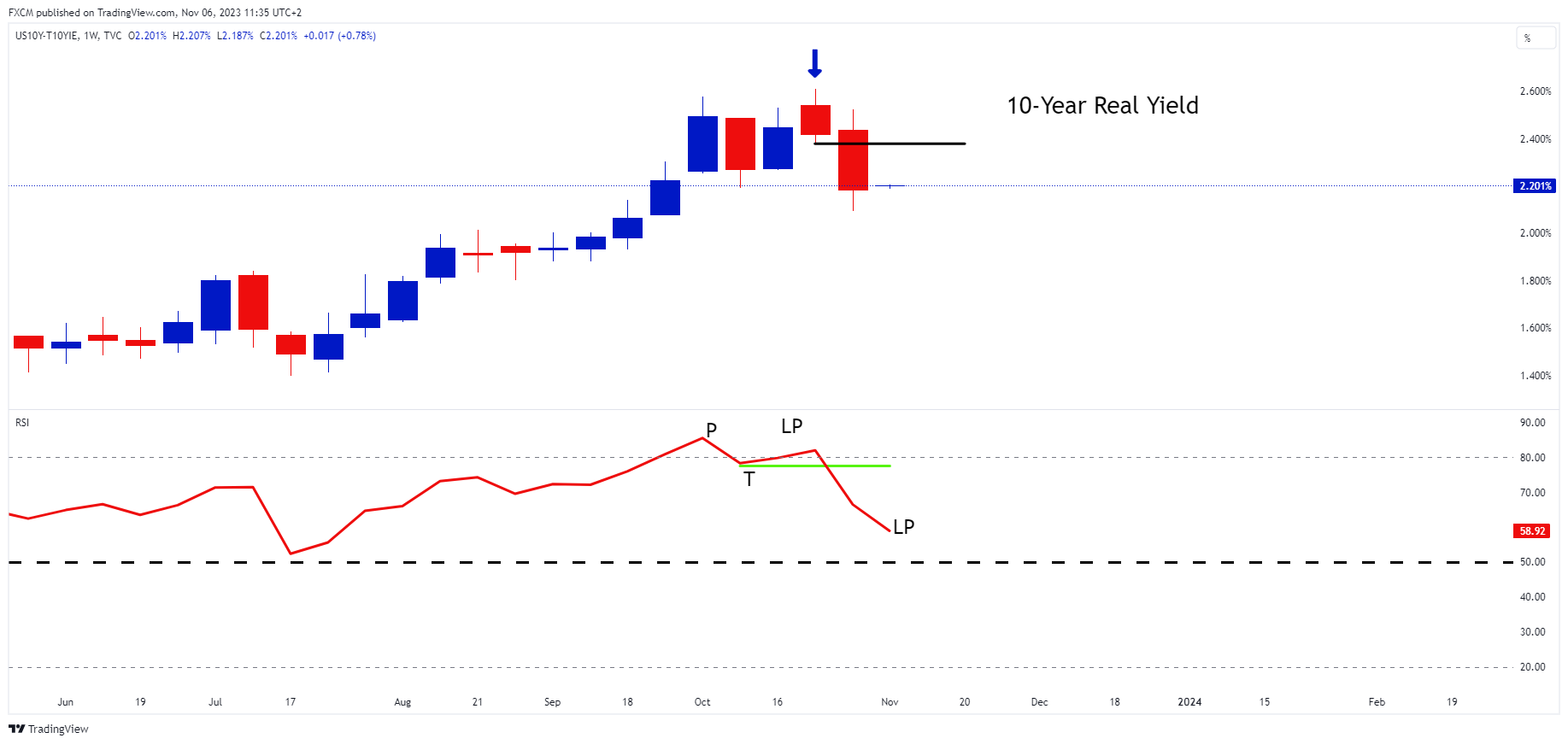 In a previous article we detailed the failure swing on the real yield weekly chart, positing that it suggested that we were near the top of the Fed's hiking cycle. Then last week and following the weaker-than-expected jobs data on Friday, the real yield completed a reference candle reversal.