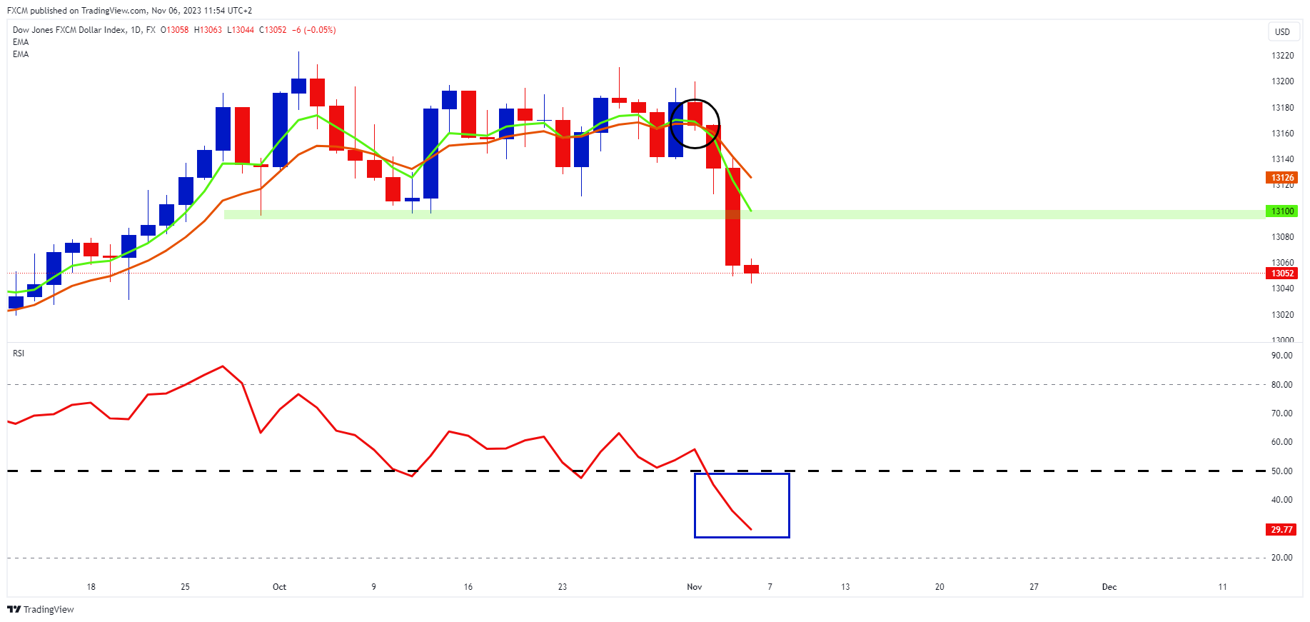 * The momentum-based RSI has dipped below 50 (blue rectangle), which is the bearish side of the indicator.