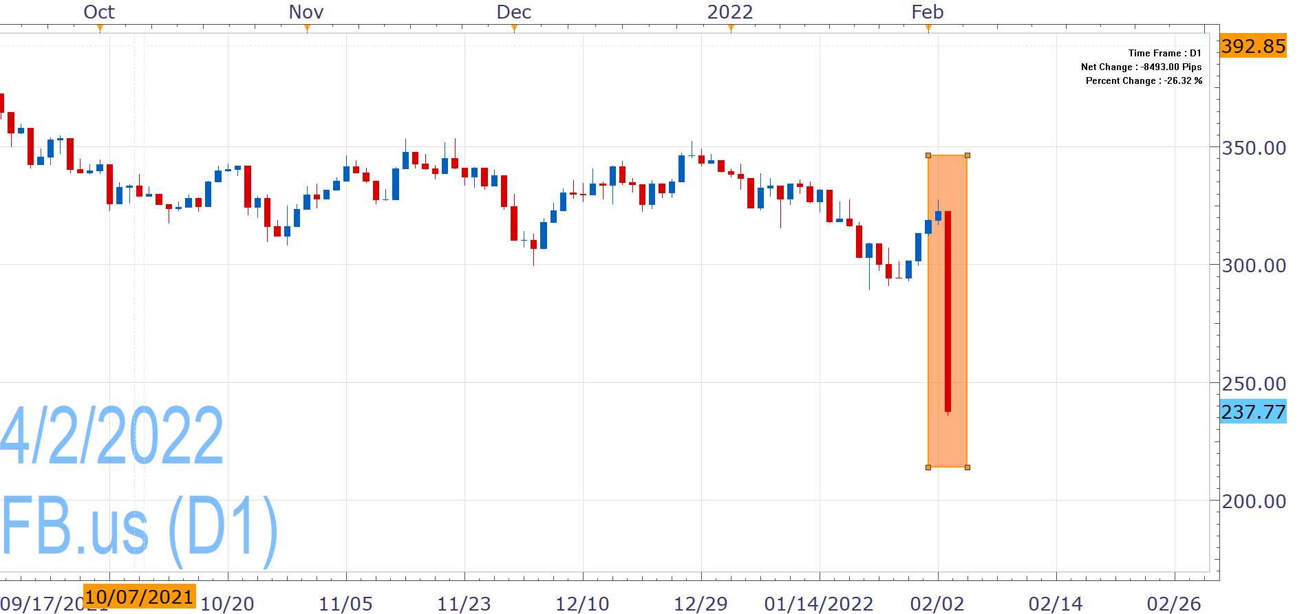 FB.us wiped out around $90 on Thursday and collapsed to its lowest level late-July 2020, after Facebook parent company, Meta, reported quarterly financial results [1] to which markets reacted negatively.