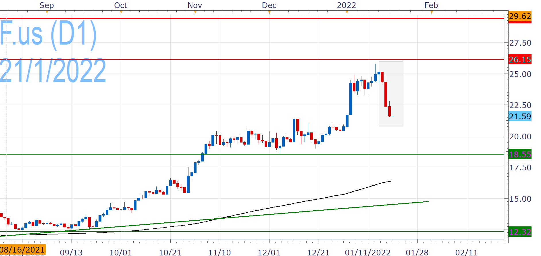 Despite upbeat news around the company and last week's multi-year high, its stock is weighed by the broader risk-off mood this week, with losses of nearly 15% for F.us, before today's open.