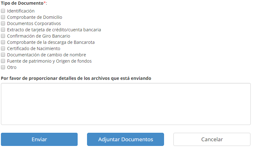 Al subir su documentación de apoyo a través de www.myfxcm.com, por favor proporcione su explicación asociada con su Fuente de Patrimonio u Origen de Fondos en el cuadro de texto en la parte inferior de la página "Subir Documentación".