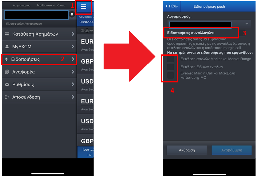 6. Επιλέξτε το πεδίο «Ειδοποιήσεις συναλλαγών»3i. Επιλέγοντας αυτό το πεδίο, εγγράφετε την συσκευή με την FXCM και αυτό απαιτείται για την ενεργοποίηση, αλλά δεν ενεργοποιεί την εγγραφή ακόμη.