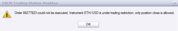 FXCM allows long and short trading on all our trading catalog. However due to the high volatility and low liquidity when trading crypto currencies, there may be instances where new positions are unable to be opened on Ether (ETH). During any period in which Ether (ETH) has a trading restriction applied, any market orders or triggered pending entry orders will be rejected and deleted. Pop ups will appear on your screen informing of the reason for the rejection.