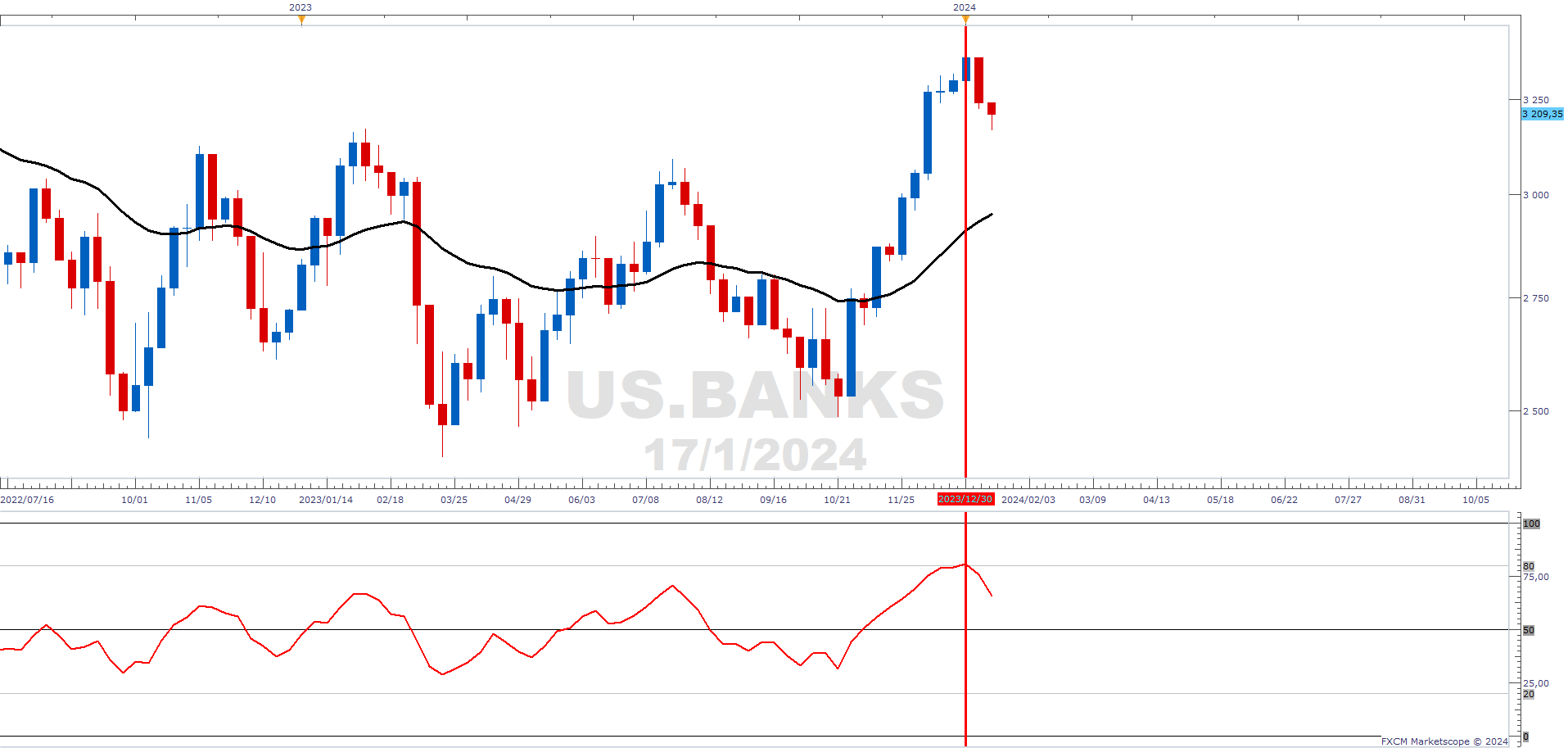 FXCM's US.BANKS basket has risen strongly since its low in mid-October last year. However, the strong appreciation resulted in an overbought condition to start 2024 (red vertical). As a result, it not a surprise to see the basket pulling back over the last week and a half as the oscillator normalises.