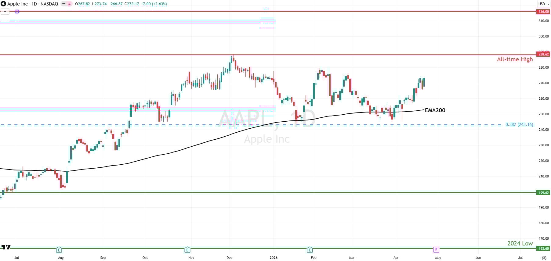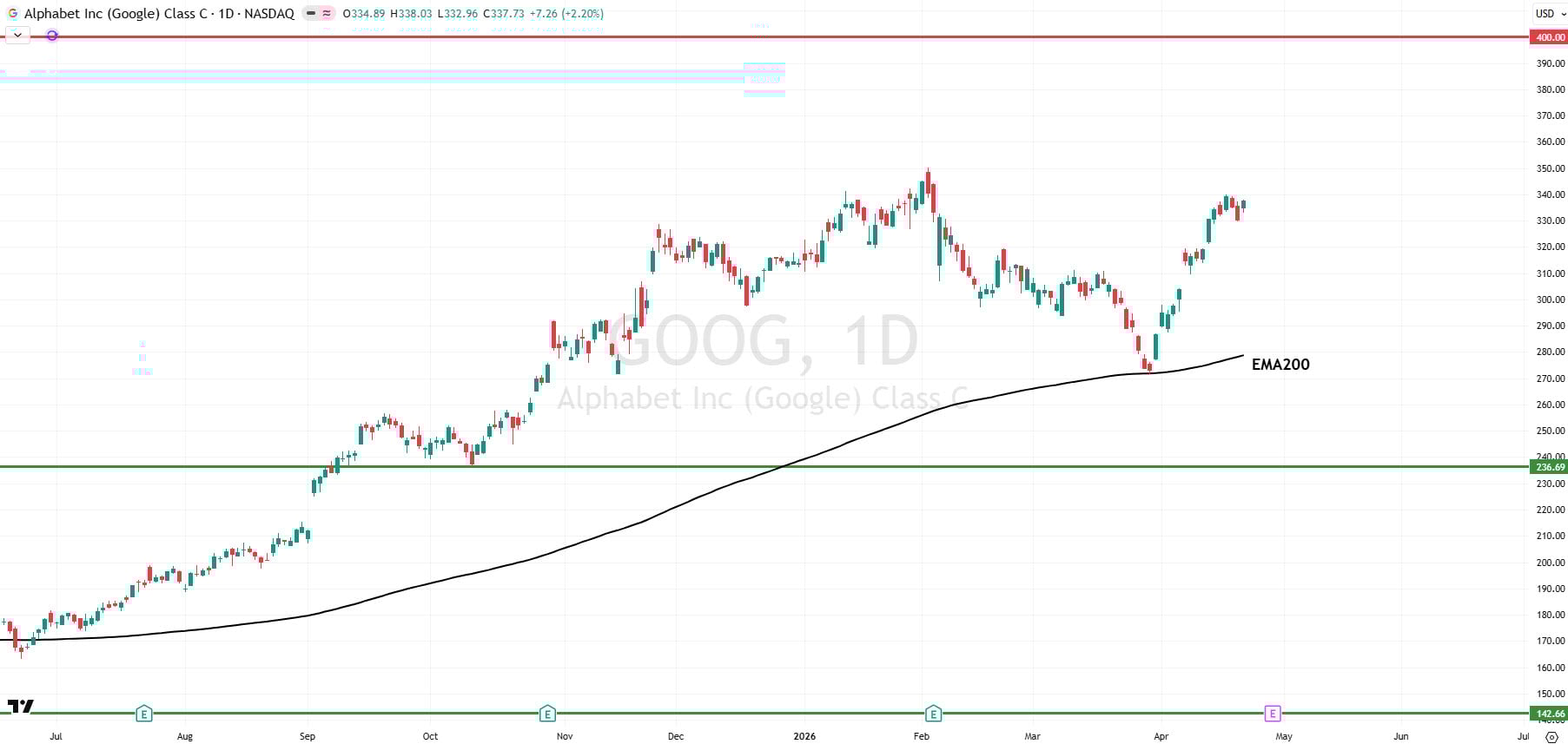 Alphabet remains a solid performer with its shares firmly in positive territory this year, thanks to its AI leadership and overall business strength. Should results and guidance sustain the momentum, the stock could extend its advance to new all-time highs. But expectations are high and any disappointment could renew pressure and a drop below the EMA200 would negate the bullish bias.