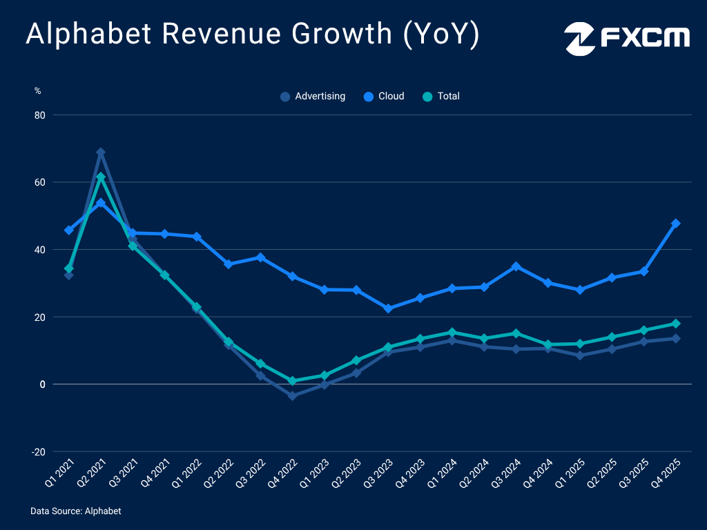 Meanwhile, Alphabet is developing its own custom silicon, bolstering self-reliance, cost efficiency and LLM performance. This benefits its cloud business, which saw revenues jump nearly 50% y/y in Q4 - the fastest pace in over four years, with a backlog that more than doubled [7]. This momentum complements rising advertising sales and overall revenues, while an expansive and diverse product portfolio provides a degree of insulation against macroeconomic volatility.
