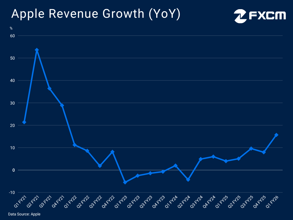 Thursday's earnings find Apple on solid footing following a blockbuster holiday quarter. Revenues for the three months ended December surged 15.7% y/y, the company's strongest performance in over four years, anchored by record-breaking iPhone sales and a vital recovery in China [11]. Momentum carries over as China shipments soared 41% y/y in the first quarter despite the market's 1% contraction according to Omdia [12], while management expects to maintain solid overall revenue growth of 13-16%.