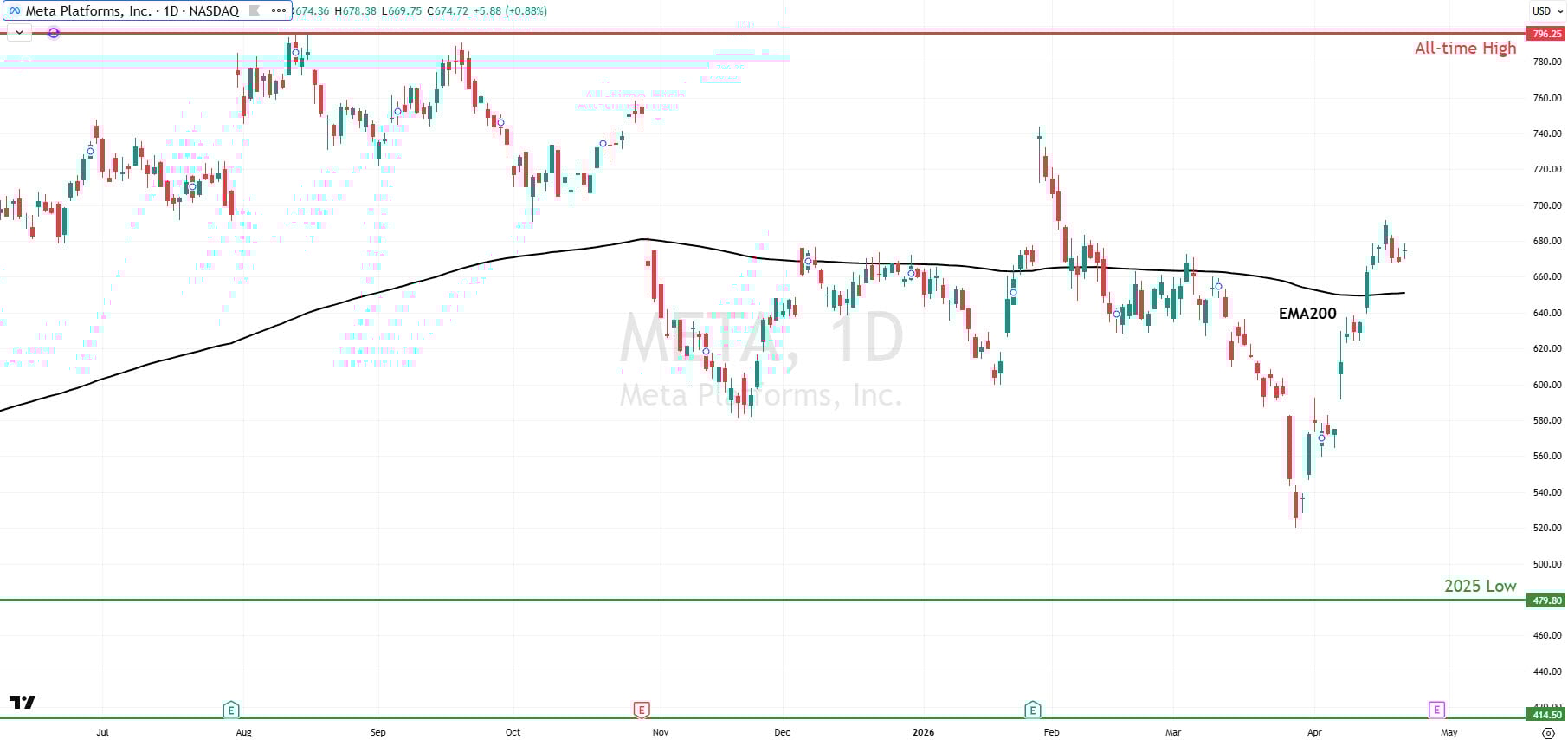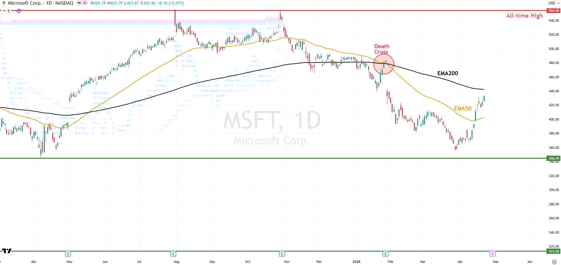 MSFT is in the red this year and the worst-performing Magnificent Seven peer, as markets are not convinced about its ability to monetise its AI investments. If this perception persists after Wednesday's results, the bearish bias could be reaffirmed, opening the door to deeper declines as a technical Death Cross has formed. On the other hand, the lower valuation may support the stock's appeal should strong signals emerge from the earnings report, potentially opening the door to a more meaningful advance.