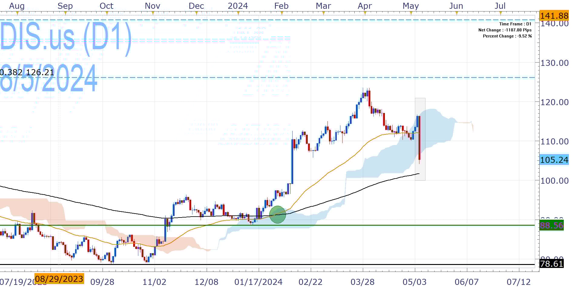 On the other hand, DIS.us rejected this pivotal level recently and Wednesday's slump brings it below the Ichimoku Cloud, exposing to the EMA200 (black line). This creates a precarious technical picture, as Closes below the EMA200 would negate the recent bullish bias and along with the Fibo rejection would bring the multi-year lows back in the spotlight (78.61).