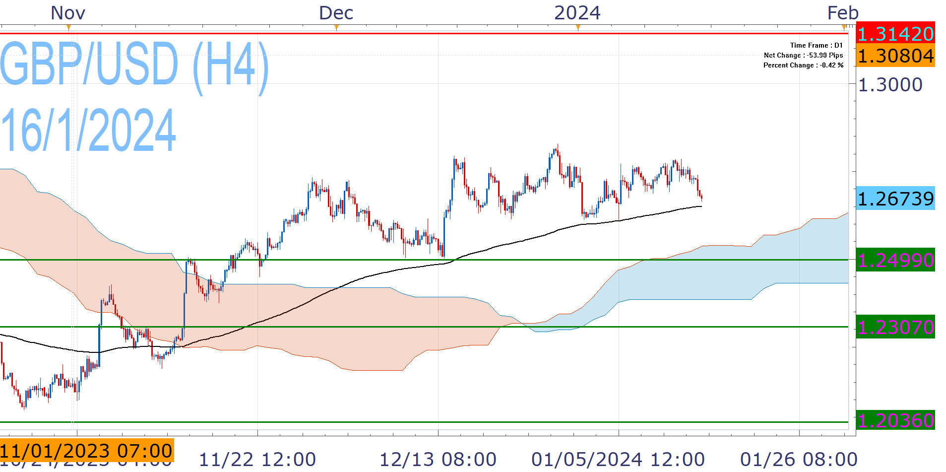 GBP/USD slides today as the slowdown in pay growth strengthens the case for peak rates and eventual cuts. This makes it vulnerable to the December lows (1.2499), but the downside appears well-protected and further losses towards and beyond 1.2307 have a higher degree of difficulty. The next leg of the move will be determined by Thursday's CPI inflation update from the UK.