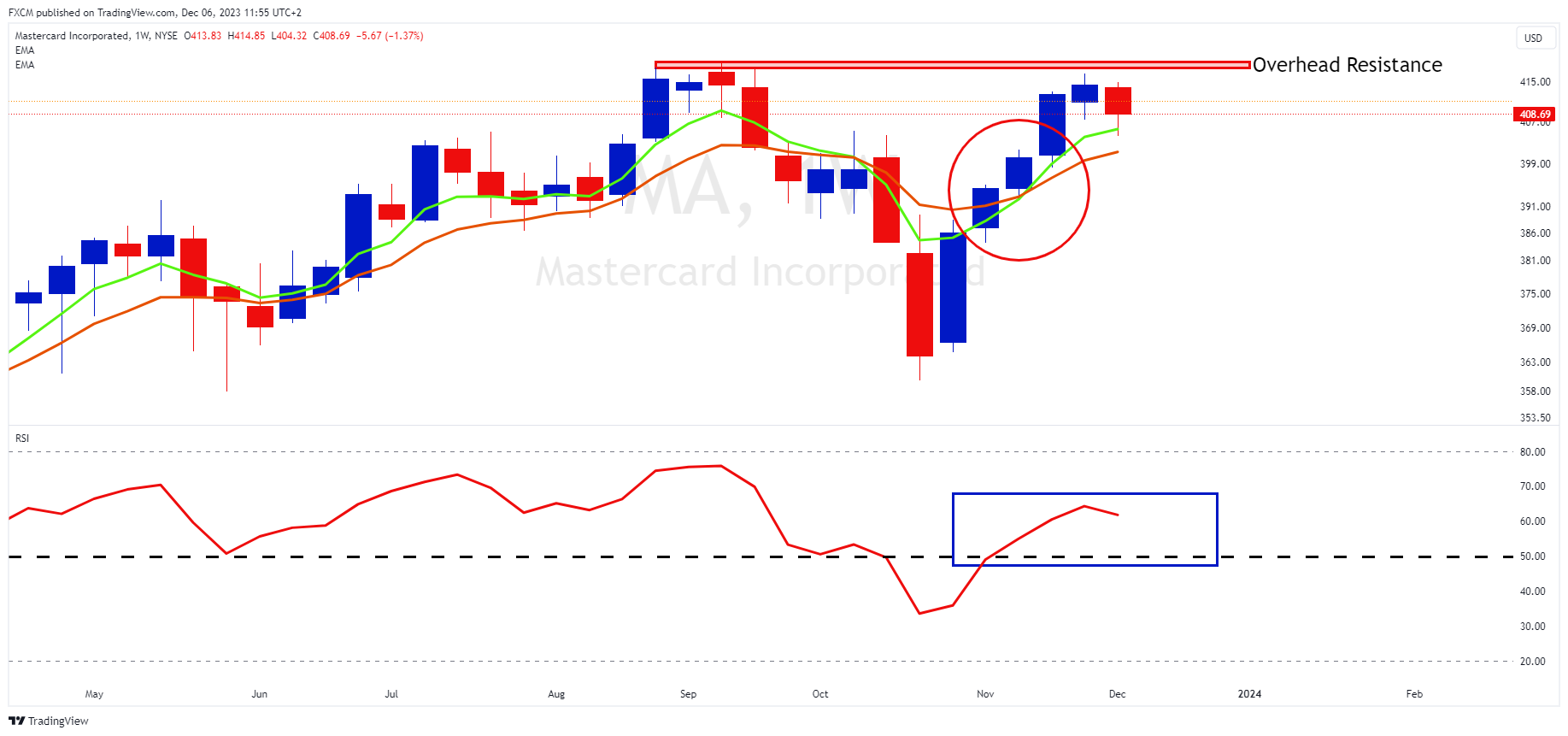 There is overhead resistance around the $418 level (red shaded horizontal). This may prove to be a headwind for the stock. However, there has been strong accumulation of Mastercard lately and, if the RSI remains above 50, it should breakout above resistance.