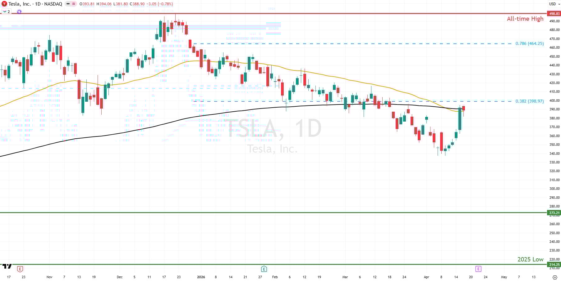 The earnings report on Wednesday 22 April arrives as the stock of Tesla Motors Inc snaps a four-week negative streak, with the outcome set to dictate its trajectory for the quarter ahead. The stock is currently testing key technical hurdles provided by the 38.2% Fibonacci level and the EMA200. Clearing these would signal that the market is ready to move past the recent automotive slump. On the other hand, a rejection at these levels would reaffirm the bearish bias and leave the door open for new lows, particularly if the financial commentary fails to inspire.