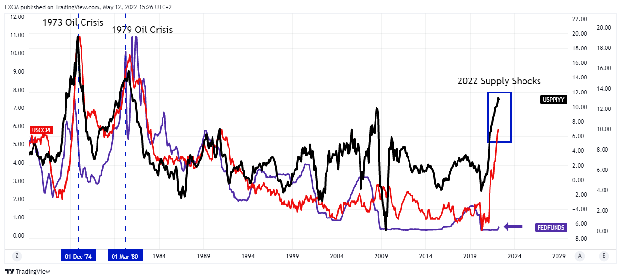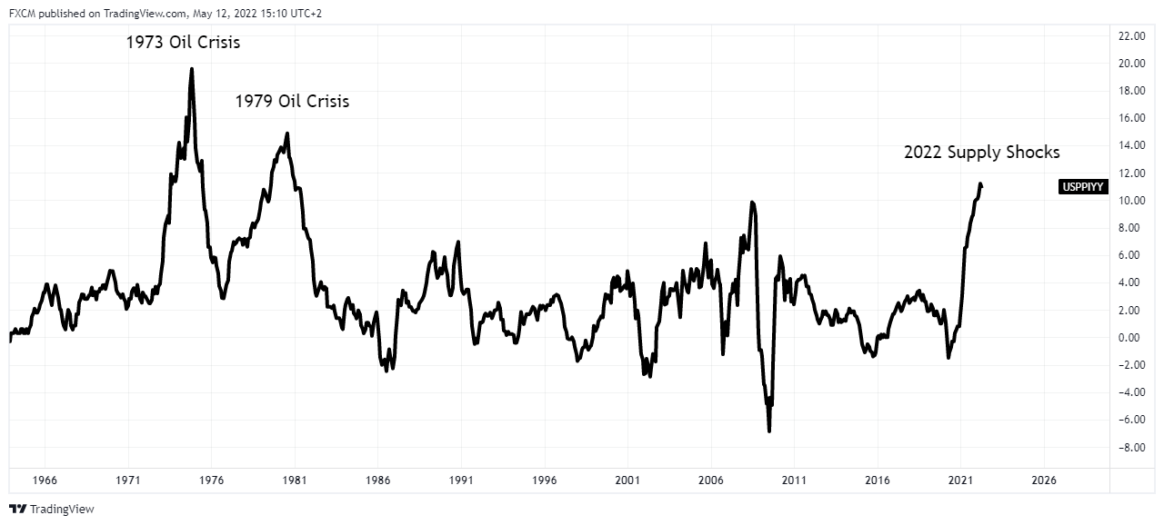 Even though both the CPI and PPI have shown slight signs of moderation, inflation is still running near 40 years highs. The Fed tends to focus on the core CPI reading, as monetary policy cannot do much to control the supply side. However, we posit that it is vital to consider the inflation picture from the PPI for this current inflationary cycle analysis. This PPI to CPI methodology is because 2022 macroeconomics has supply-side shocks, which, although rare, are an essential part of the current inflation environment. Consider the following chart showing the PPI series from May 1964: