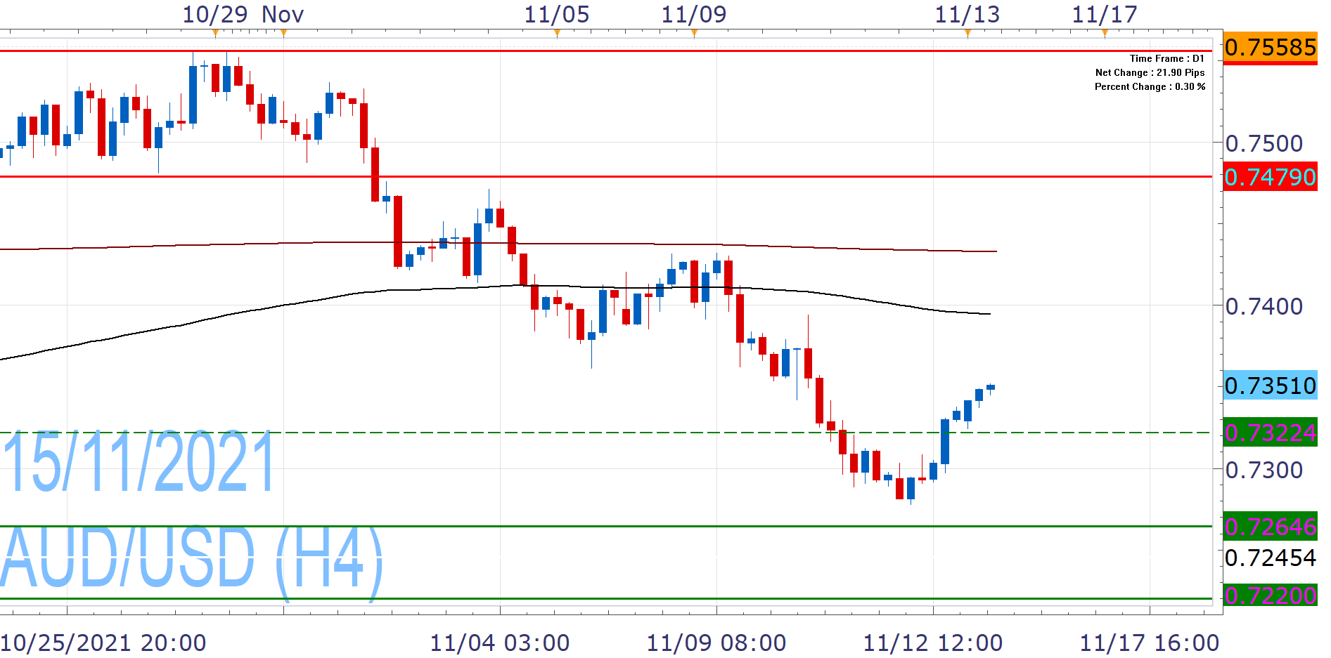 As such, it extends Friday's rebound past 0.7341, which marks the 23.6% Fibonacci of the October High/November low drop. This can lead to a larger correction towards the 38.2% Fibonacci but this area poses a strong resistance as EMA200 sits just a little higher (0.7382-95). Sustained risk on mood and/or positive catalyst will be need for further gains.