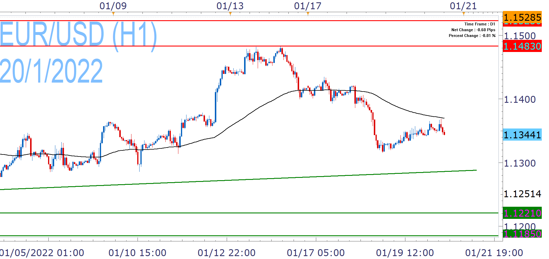 Having rejected the key 38.2% Fibonacci of the "September High/November Low" drop, bias remains on the downside, and we remain cautious about its upward aspirations. As such, it is vulnerable to the ascending trend-line from November's 2021 lows (at around 1.1300-1.1290), but it is probably early to talk about a larger drop towards 1.1221.