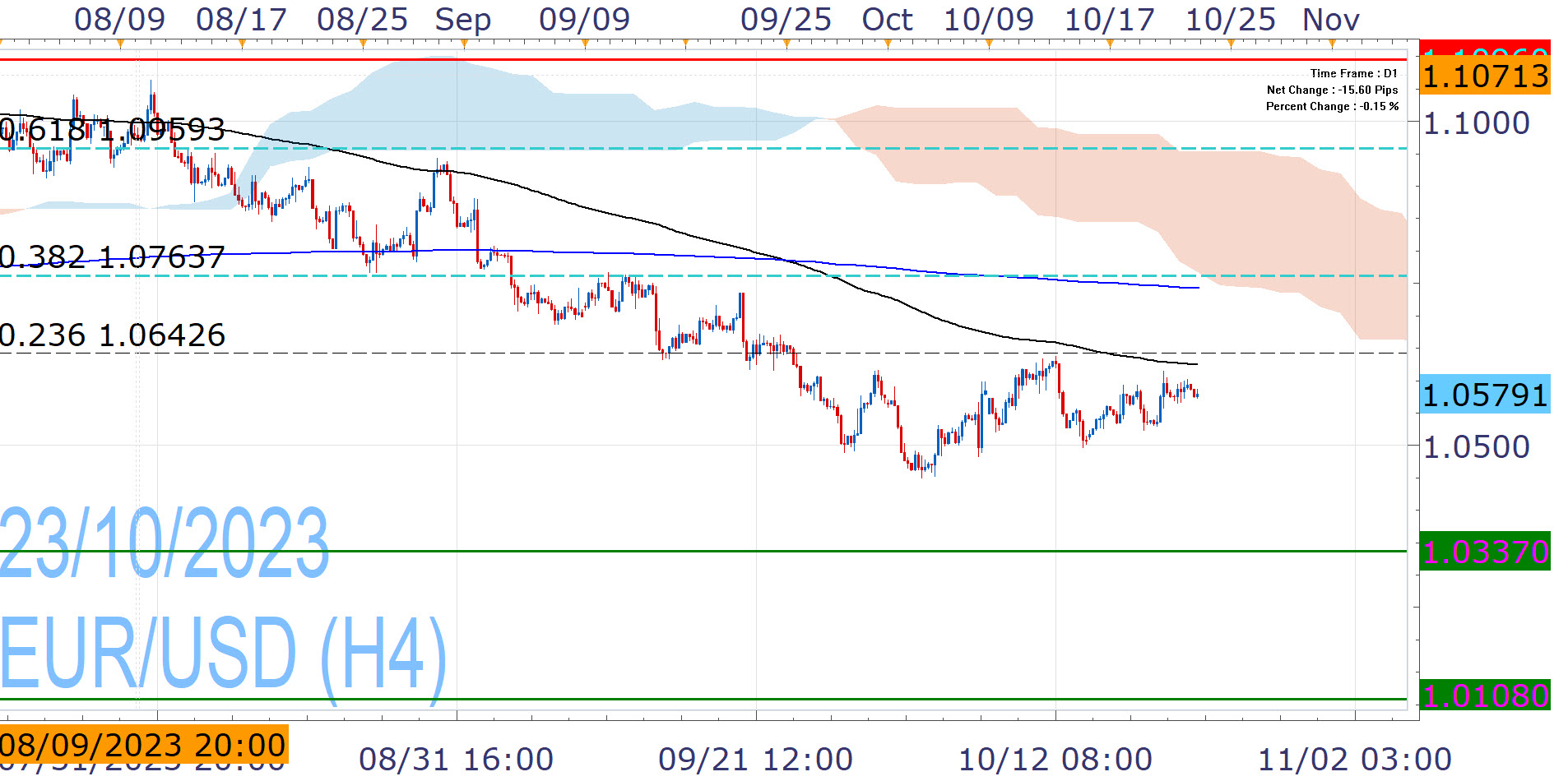 The European Central Bank had hinted at peak rates in September [1], opening the door for a hold at Thursday's upcoming pivotal decision. If policymakers opt to stay on the sidelines indeed, it would be the first pause after ten consecutive hikes worth 450 basis points. The European economy is in a bad shape as indicated by a series poor PMIs and GDP figures, with Germany – its main engine – expected to contract by 0.5% this year, according to the International Monetary Fund [2]. This creates apprehension around further tightening and the latest inflation figures showed substantial deceleration. However, it is far from the 2% target and Ms Lagarde had kept the door open to more hikes.