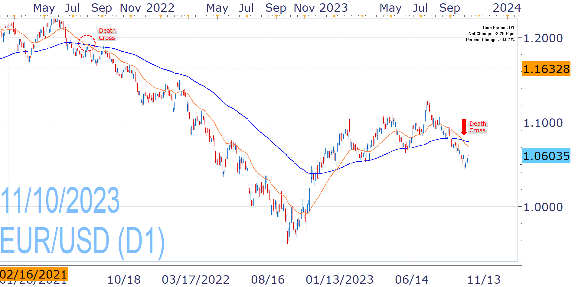 Below the 200Days EMA (black line) immediate bias remains on the downside and EUR/USD is still in risk of new 2023 lows (1.0448), although deeper losses below 1.0337 have a higher degree of difficulty. The Death Cross on the daily chart (EMA50 < EMA200) does not allow for much optimism. This formation is often a precursor of sustained weakness. It last occurrence was around two years ago, eventually leading the 2022 multi-year lows.