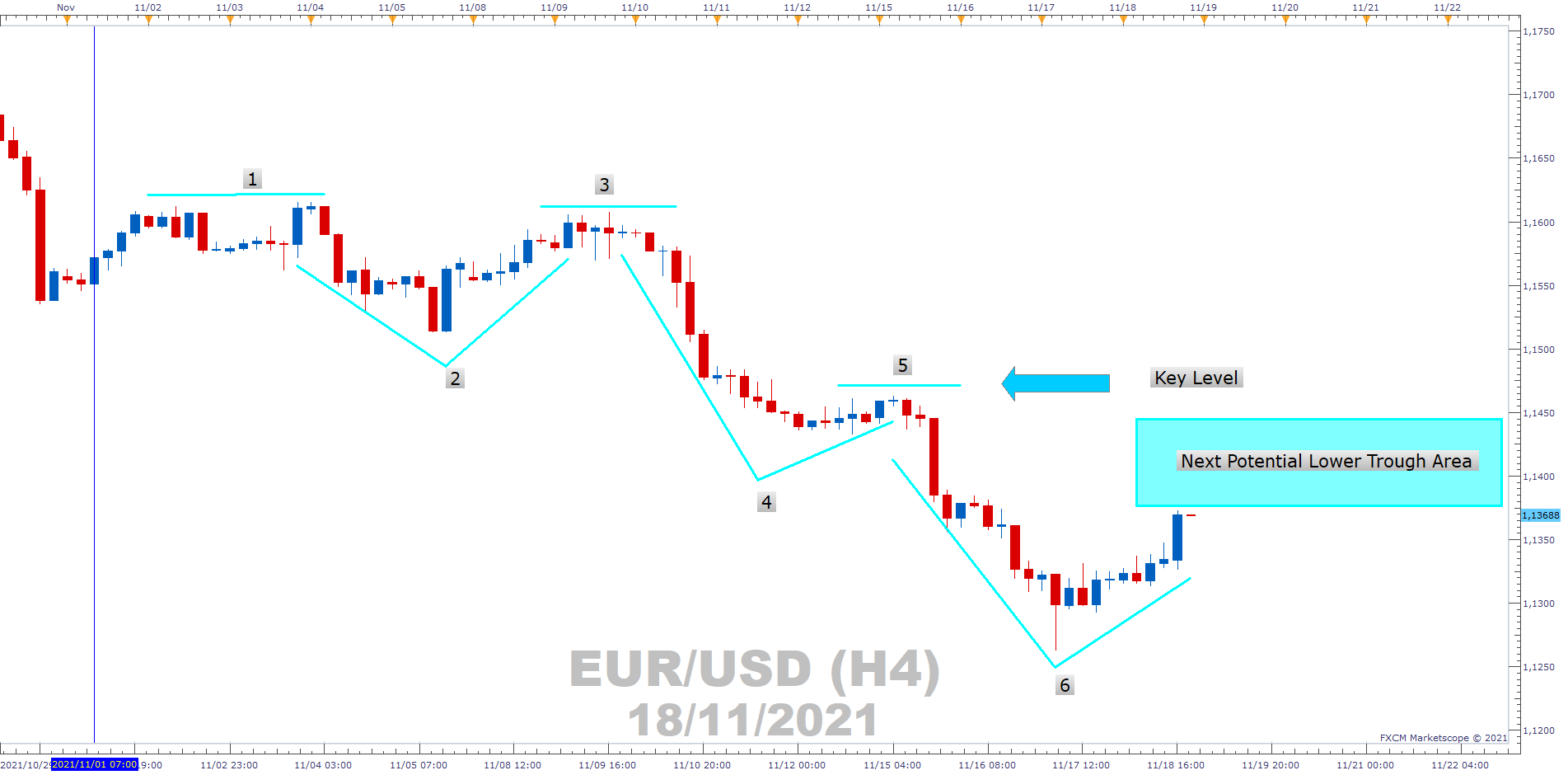 This is noteworthy as this defined the current trend of EURUSD for November. Since then, price action has resulted in area 5 and area 6. This has evolved the downtrend as follows: