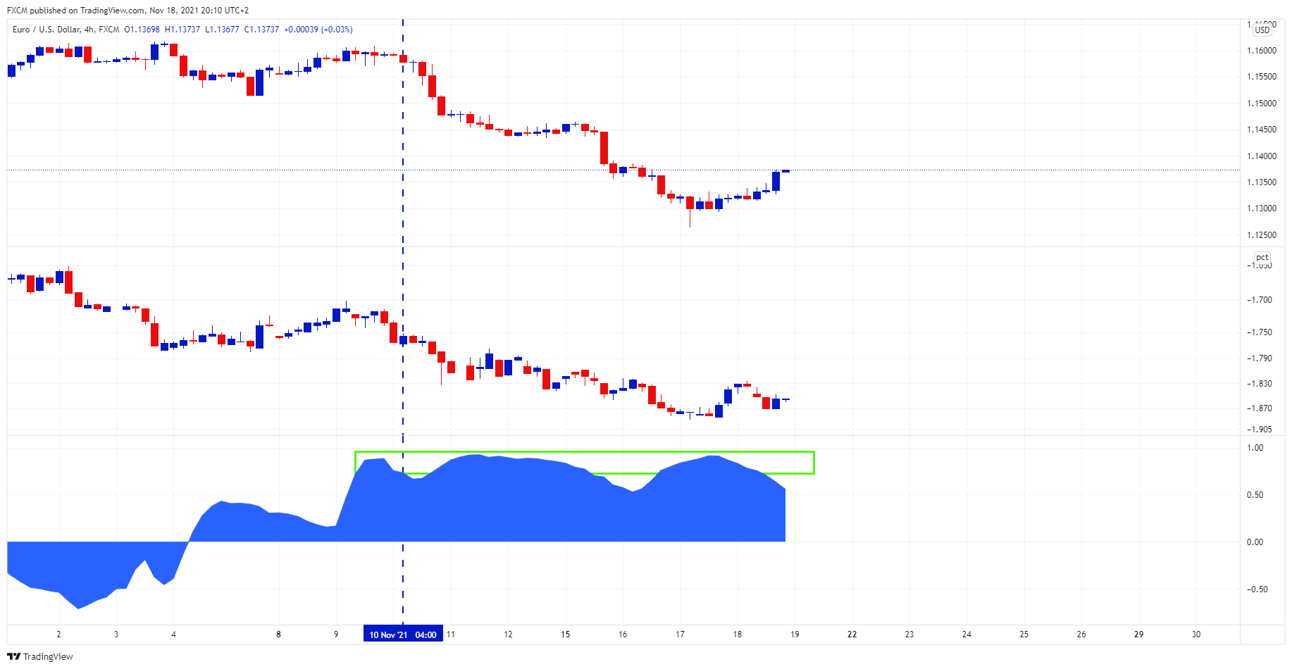 Central banks have typically attributed a temporary status to inflation; however, trimmed mean prices show deeper and broader increases in the US than expected. The H4 charts show the ebb and flow of the trend progression for both the EURUSD pair and the yield spread. If the market continues to adjust for this November dynamic, rallies are likely to be very compelling indeed.