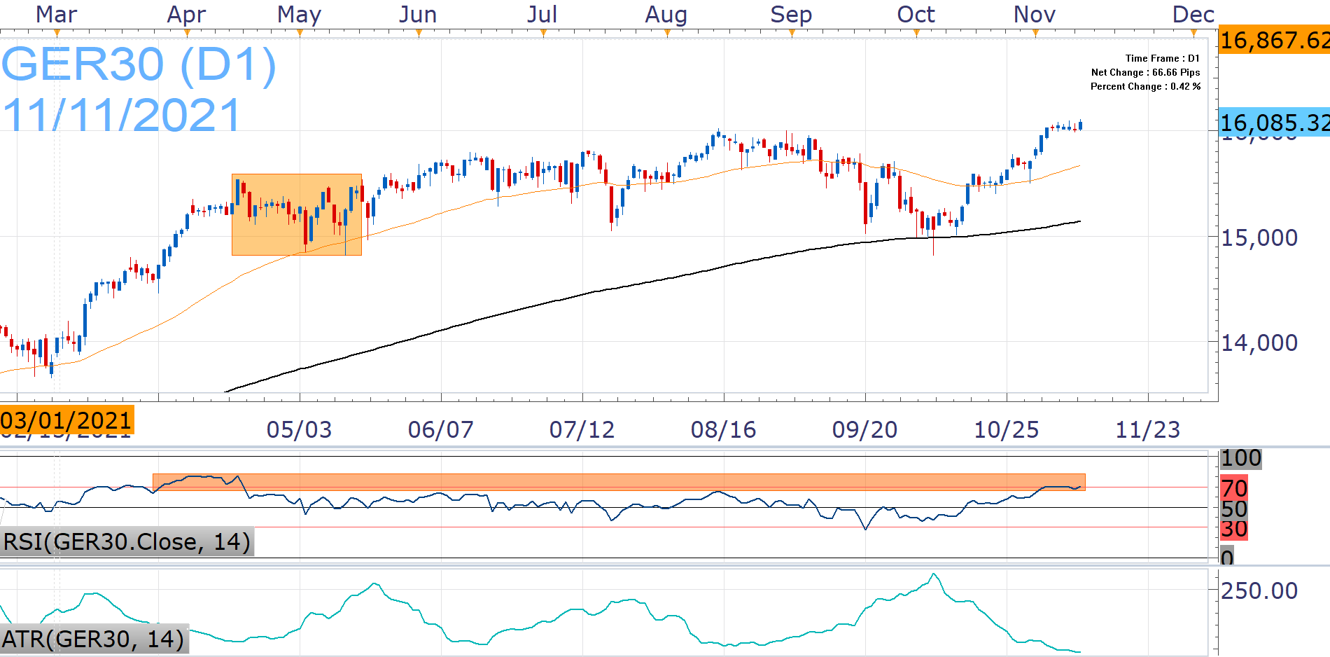 Despite multiple 2021 highs this month, progress is slow and risk of pullbacks below 16,000 does not go away, with the next support provided by the October upwards trend line (at around 15,900).