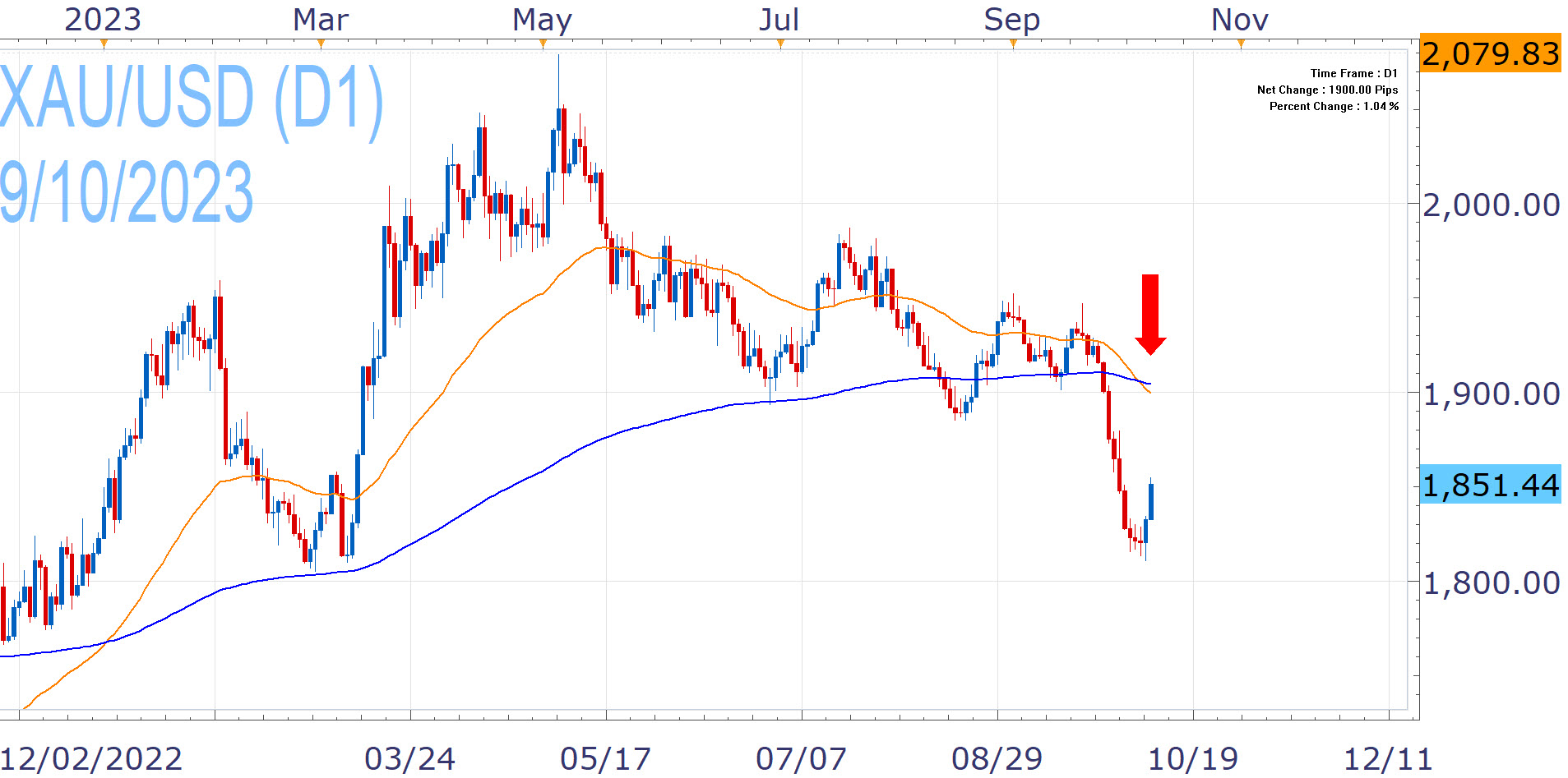 Despite today's surge, XAU/USD comes from a losing month die to the Fed's hawkish bias which benefits the greenback and Friday's strong NFPs support the higher-for-longer narrative. The commodity is in risk of new 2023 lows (1,804), although further losses towards and beyond 1,765 may prove elusive in the near term. The daily chart is also unfavorable since a Death Cross has formed (EMA50 < EMA200), which is often a precursor of sustained weakness.