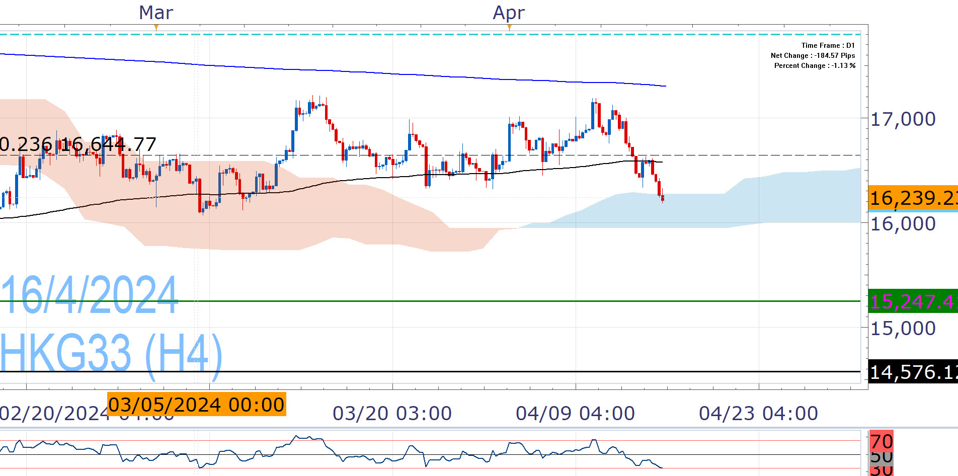 HKG33 is weighed by the risk aversion and the better than expected GDP from China could reverse the negative sentiment. First quarter GDP came in better than anticipated, as the economy grew by 5.3% y/y and 1.6% q/q, with the latter being the biggest expansion in a year. That is a strong print, but the rest of today's data were not as encouraging. Industrial production at 4.5% y/y and retails sales at 3.1% y/y, marked the smallest increase in at least six months. China's recovery continues to be rocky, with weak consumer demand, subdued factory activity despite the March expansion and the property sector in distress.
