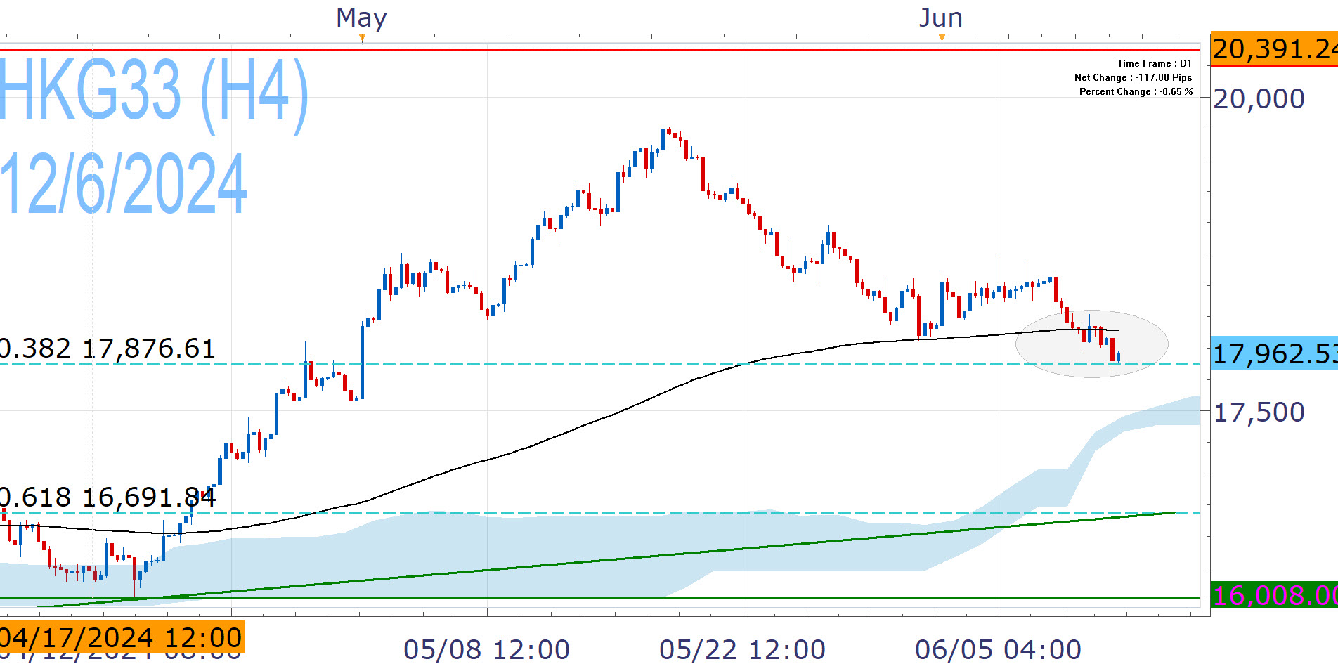 After the February-May relief rally, HKG33 has pulled back over the past few weeks and extends the slide today, moving below the EMA200 and testing the pivotal 38.2% Fibonacci of this year's high/low advance. This brings the ascending trend line from the 2024 lows in the spotlight, although bears would need fresh impetus to challenge it.
