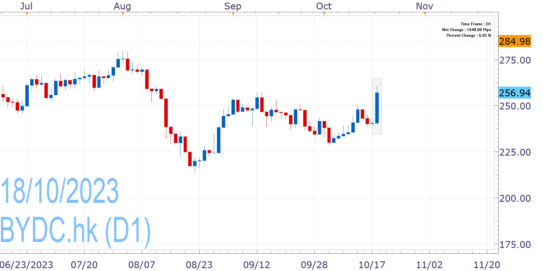 Auto giant BYD Co. meanwhile, one of the hang Seng's biggest constituents, announced today strong earnings guidance, with its stock surging more than 7%. The company expects its Q3 net profit to soar up to 101.99 compared to a year ago, to approximately RMB 9.55-11.55 billion (roughly 1.3-1.6 bln USD). [1]