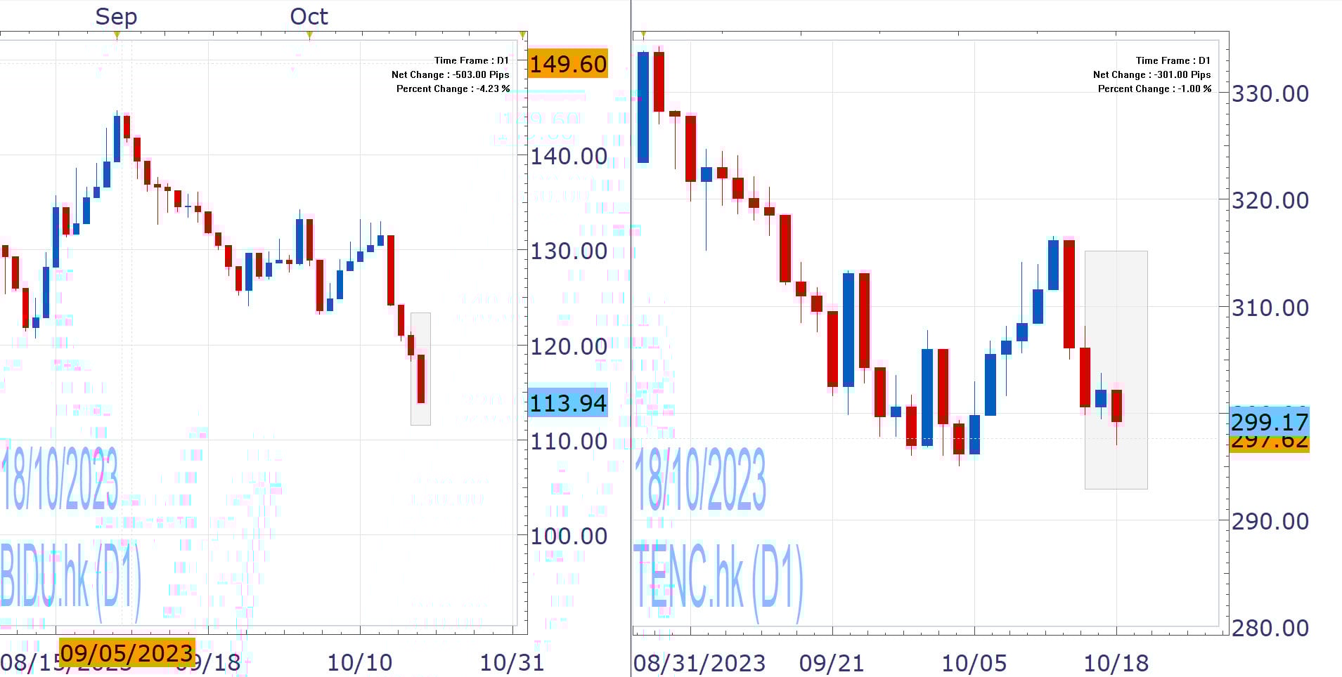 Nvidia who has enabled the AI revolution, said yesterday that the new action by the US government would restrict shipments of integrated circuits such as the A800 and the H800, which were previously allowed [3]. NVDA.us shed nearly 5% on the news. The stocks of Chinese tech giants Baidu and Tencent Holdings that use Nvidia's semiconductors, dropped today in Hong Kong.