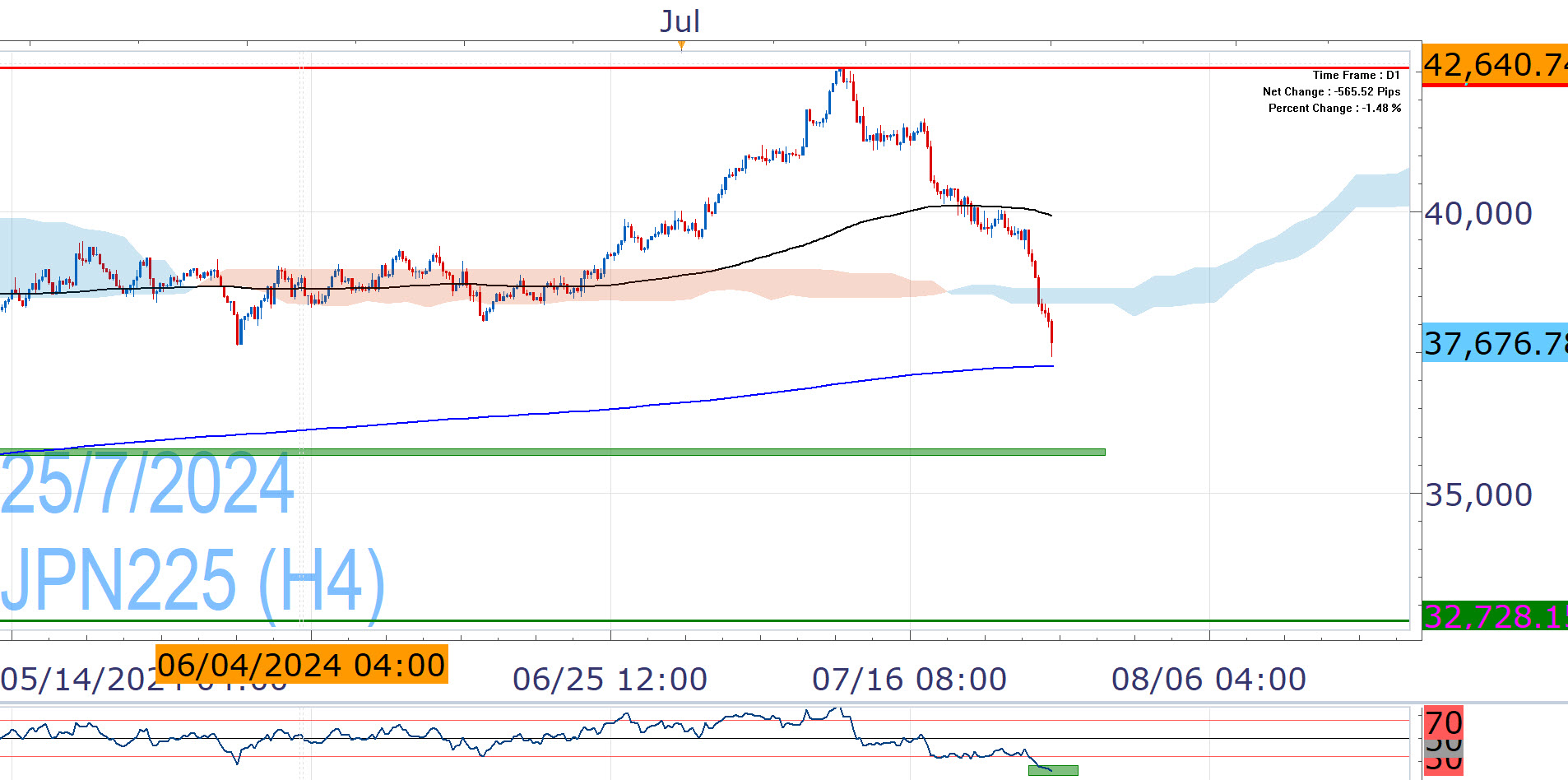 These prospects along with FX intervention have also helped then rebound and persistence could make Japanese equities less appealing to foreign investors. These forces are now playing out, as JPN225 enters correction territory, losing more than 10% from its record peak. It threatens the critical 200Days EMA (blue lines) and a breach could open the door to deeper losses.